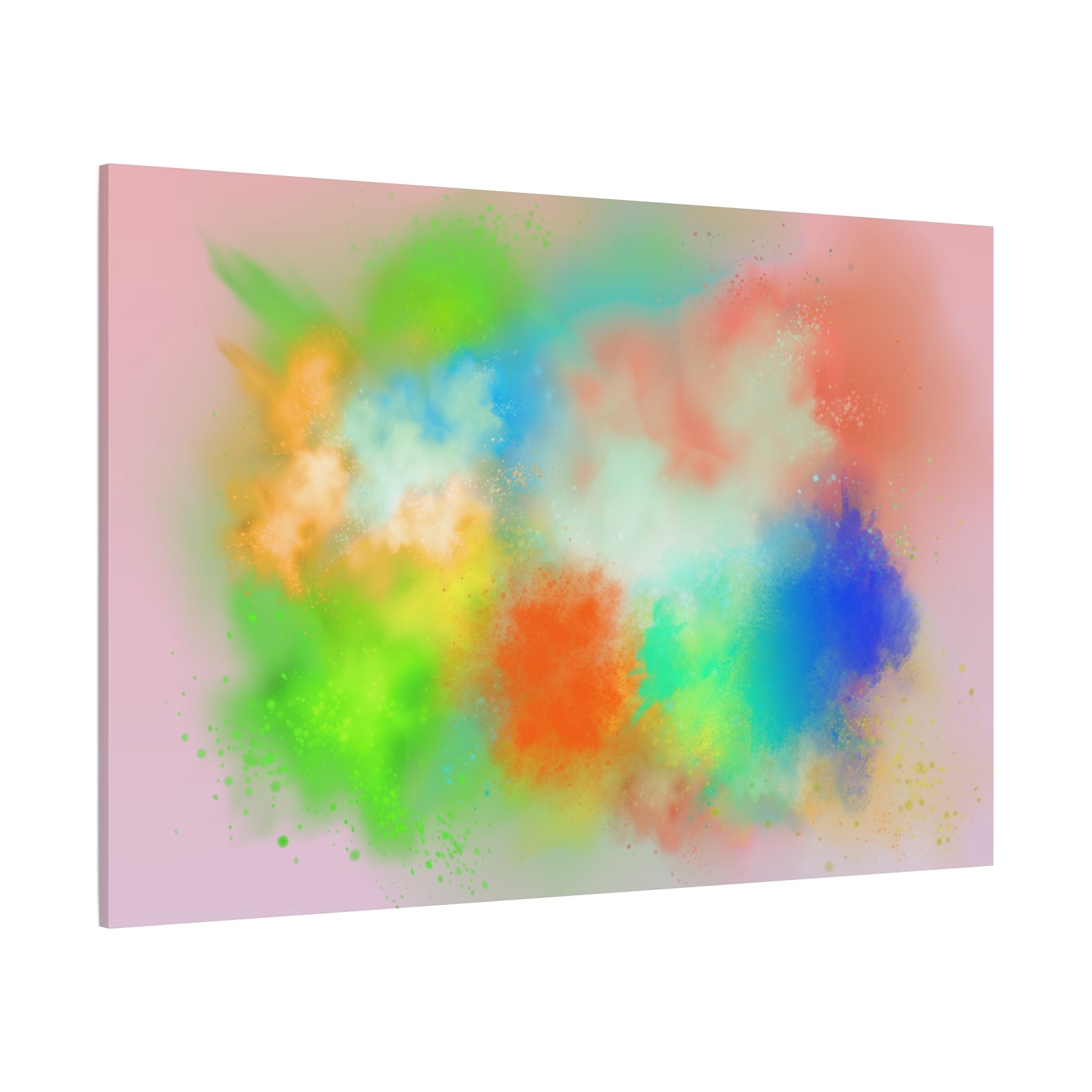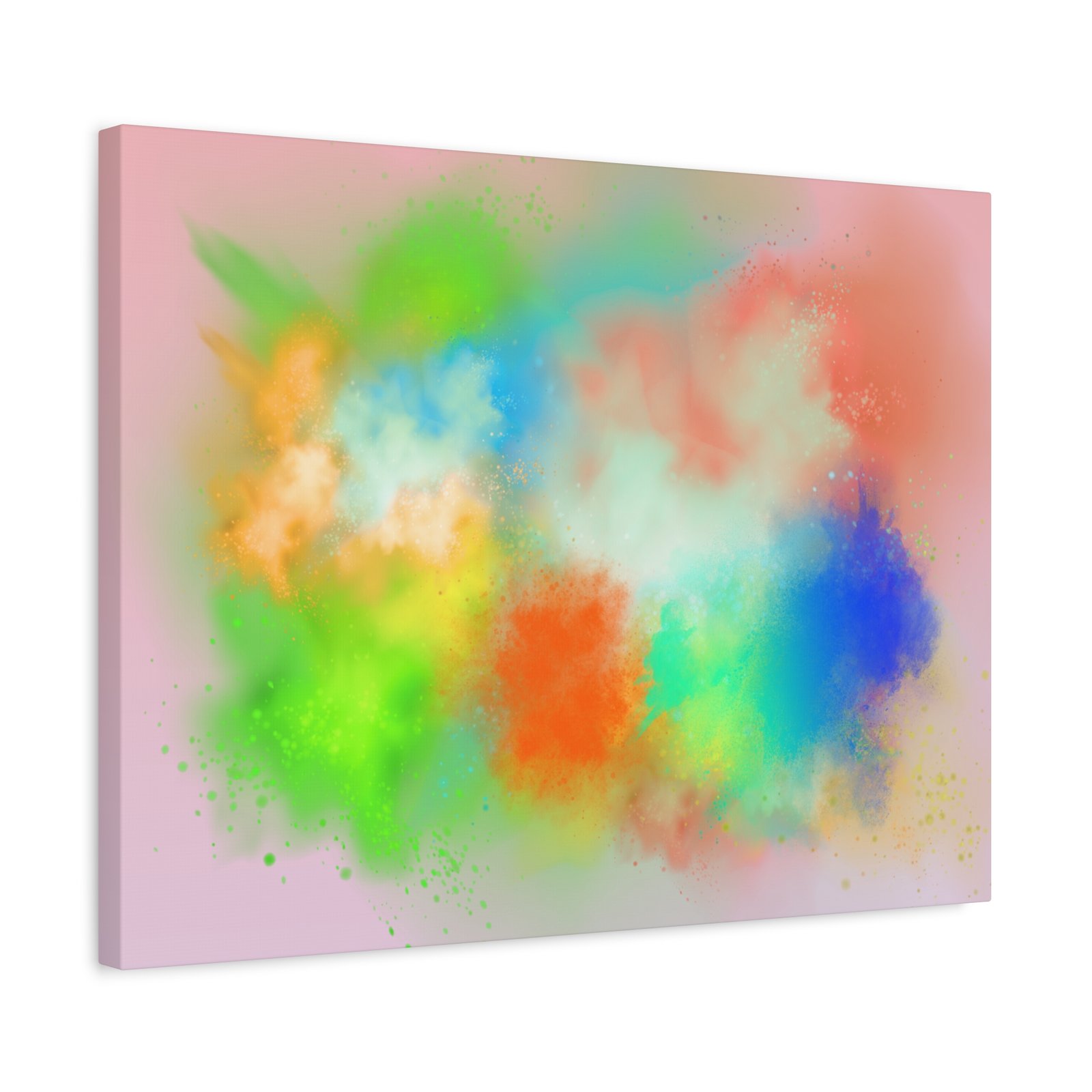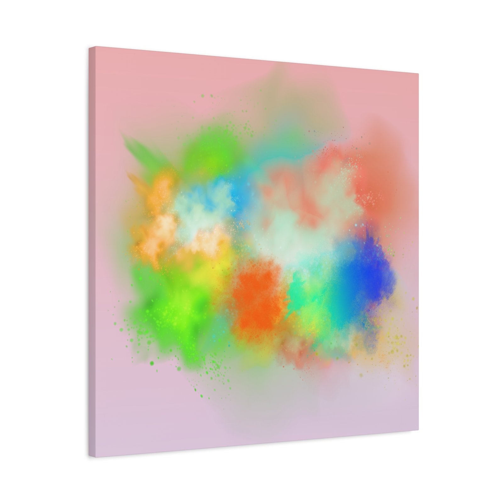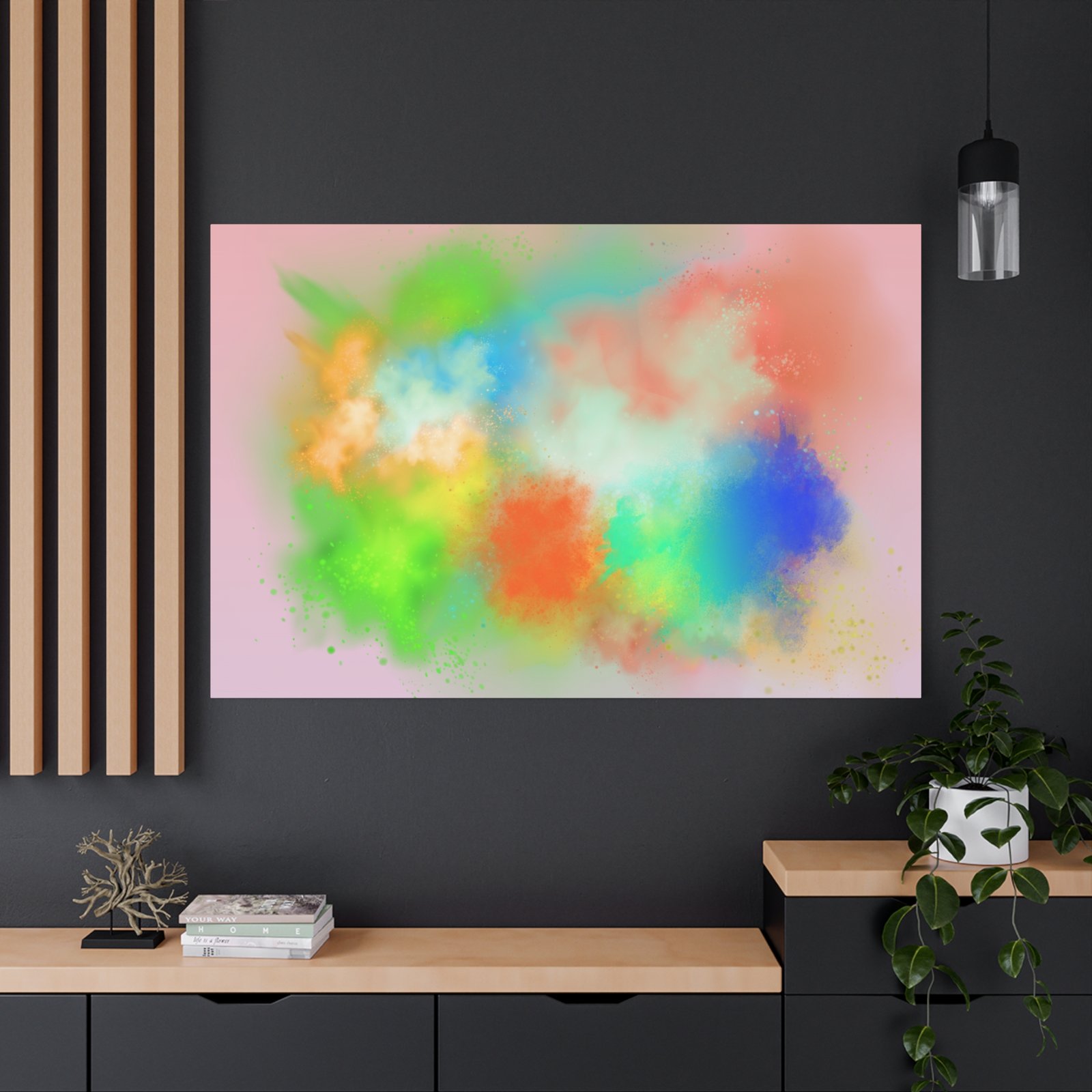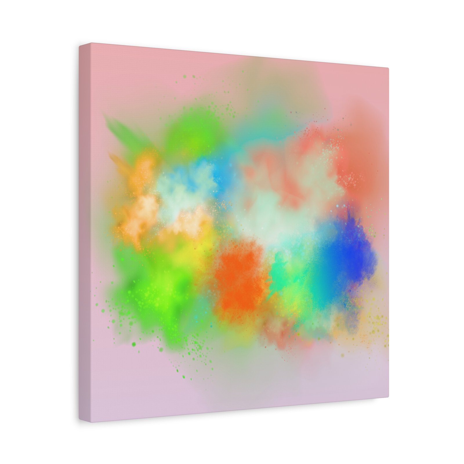 A vibrant stretched canvas that brings an airy splash of color into calm, modern spaces. Soft pink undertones cradle bursts of emerald, cobalt, coral and sunshine—like a painterly breath captured mid-motion. Lightweight yet sturdy, the matte finish mutes glare and highlights texture so the colors feel layered and alive on the wall. Hang it above a reading nook, over a minimalist mantel, or in a creative workspace to invite warmth and playful energy without overwhelming the room. The subtle depth from the wrapped edges and the secure back-hanging hardware keep it looking polished and effortless.