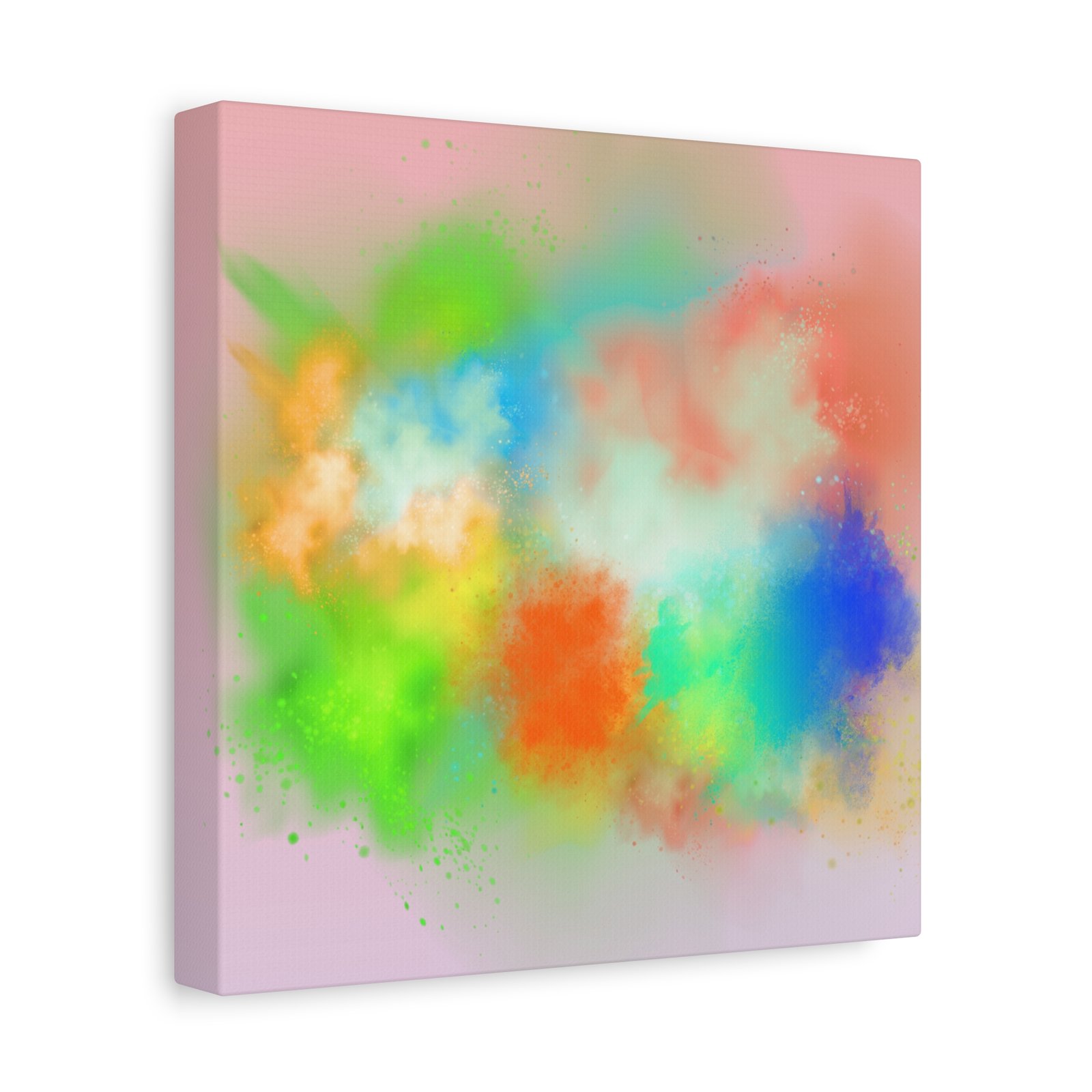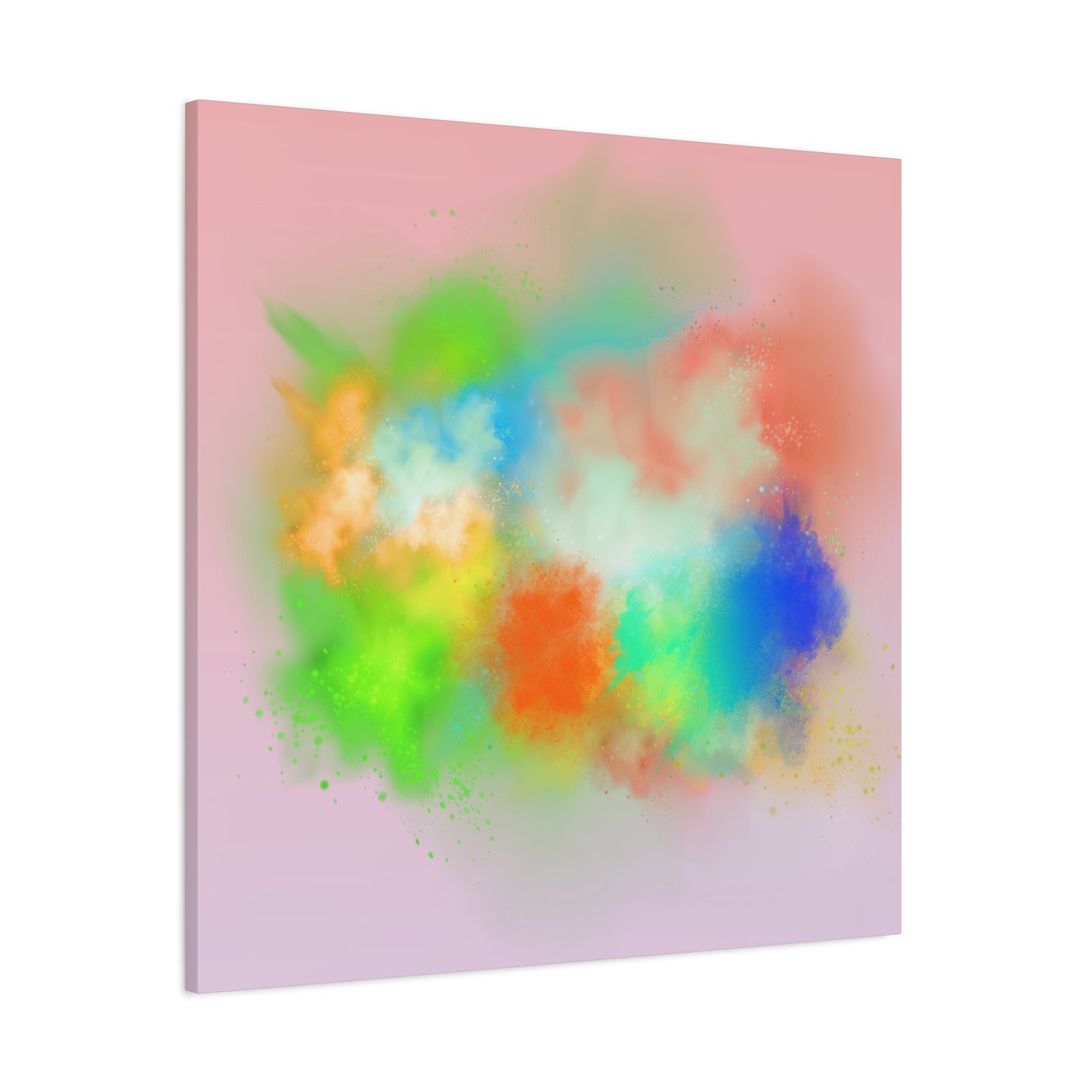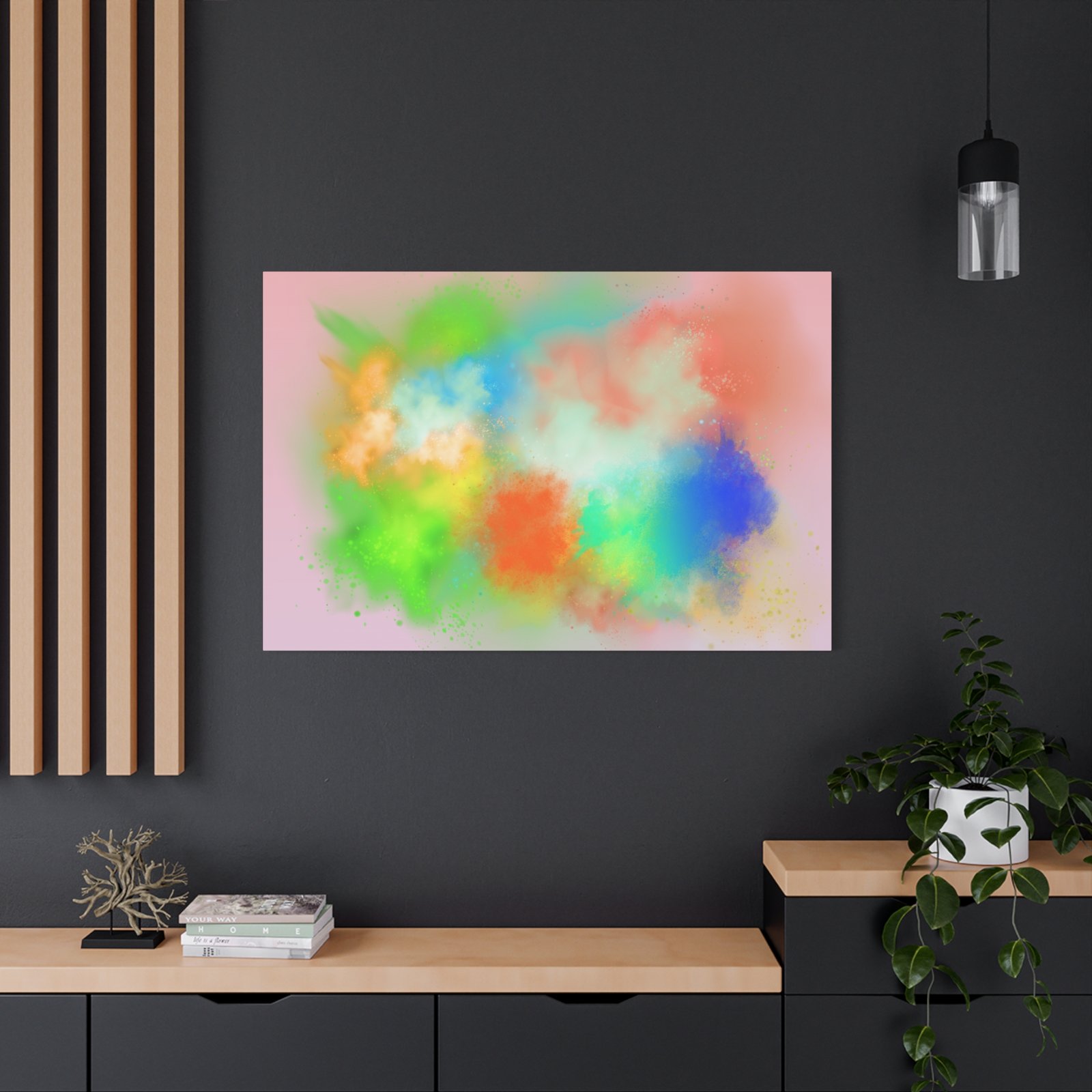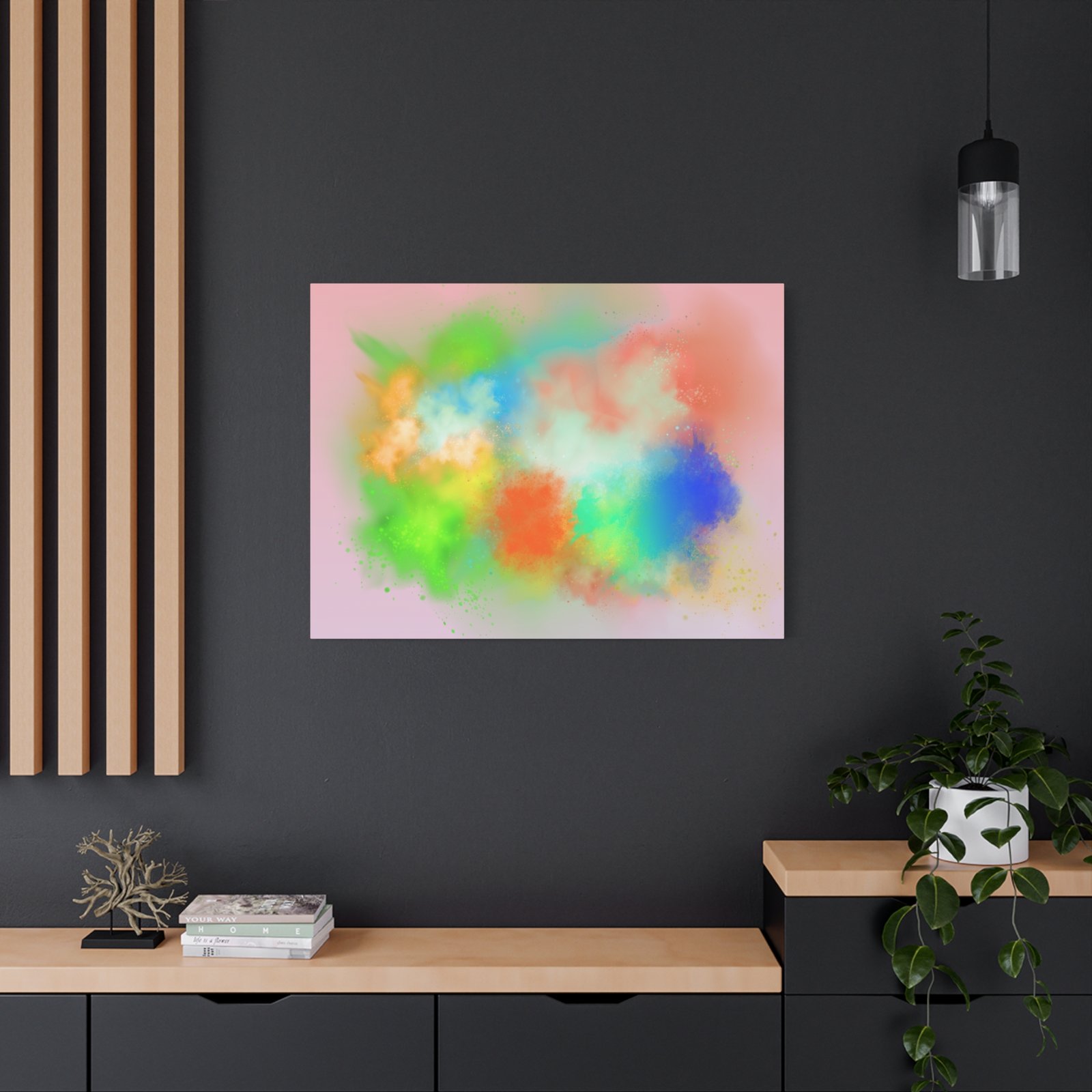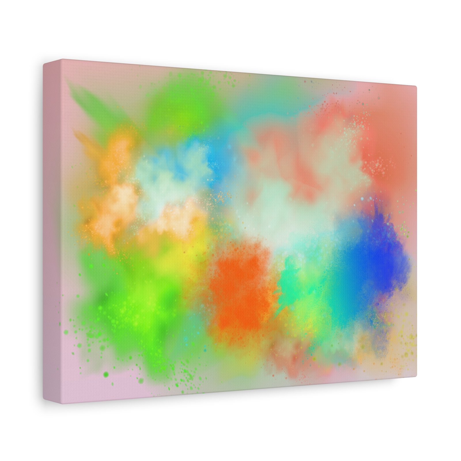 A vibrant stretched canvas that brings an airy splash of color into calm, modern spaces. Soft pink undertones cradle bursts of emerald, cobalt, coral and sunshine—like a painterly breath captured mid-motion. Lightweight yet sturdy, the matte finish mutes glare and highlights texture so the colors feel layered and alive on the wall. Hang it above a reading nook, over a minimalist mantel, or in a creative workspace to invite warmth and playful energy without overwhelming the room. The subtle depth from the wrapped edges and the secure back-hanging hardware keep it looking polished and effortless.