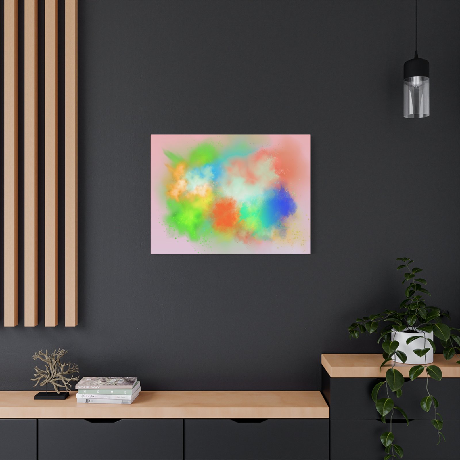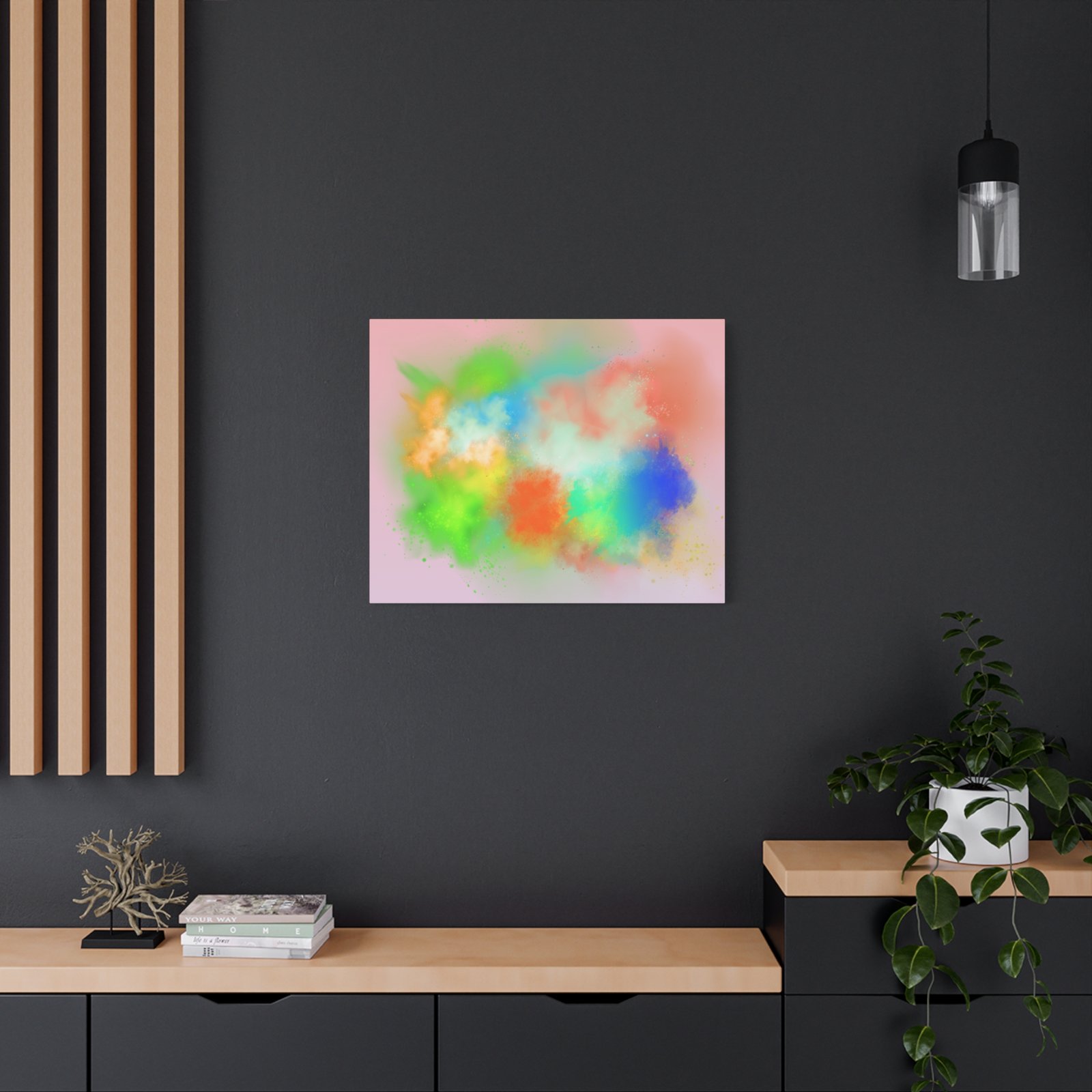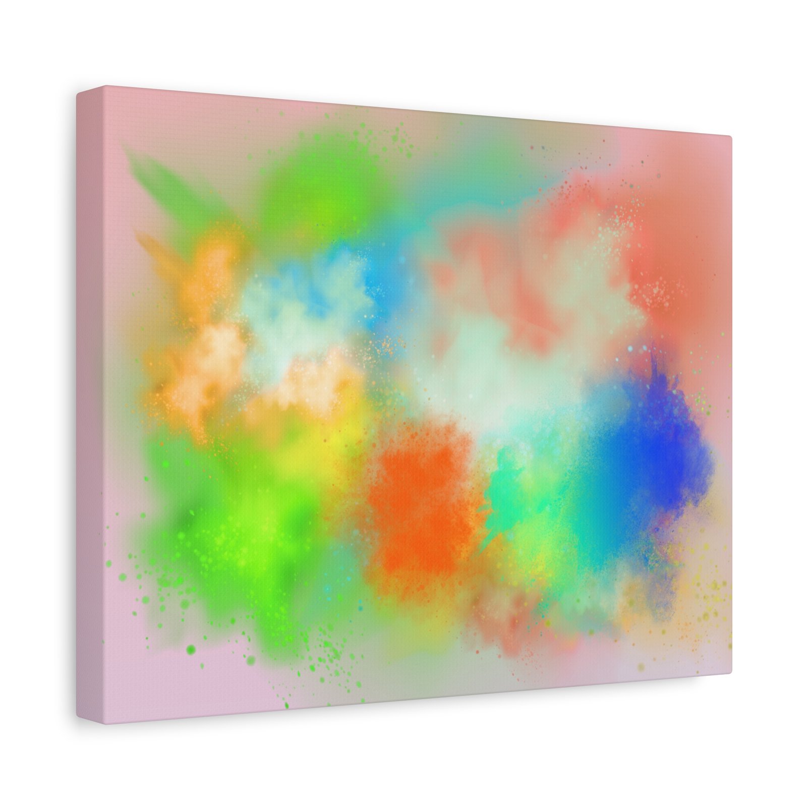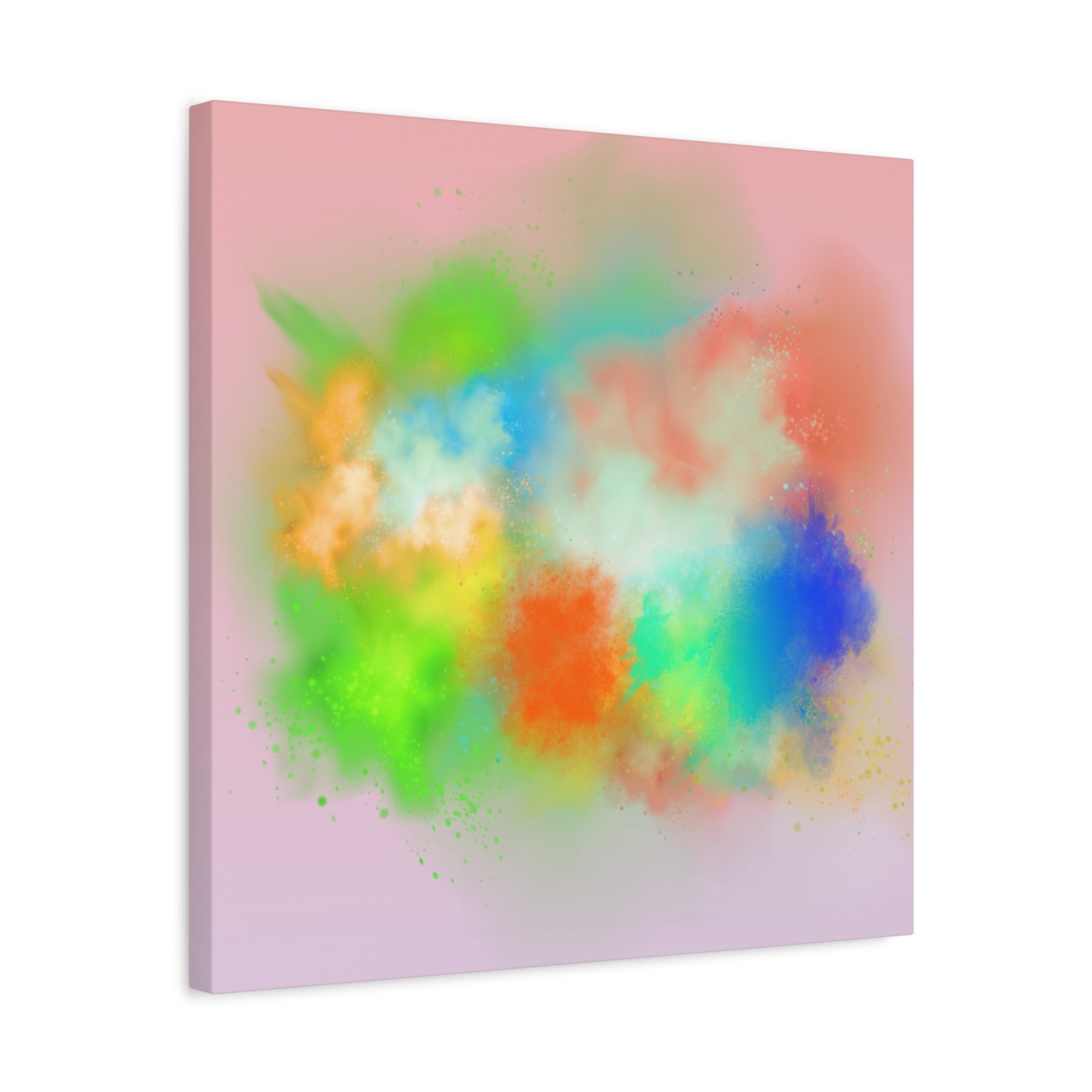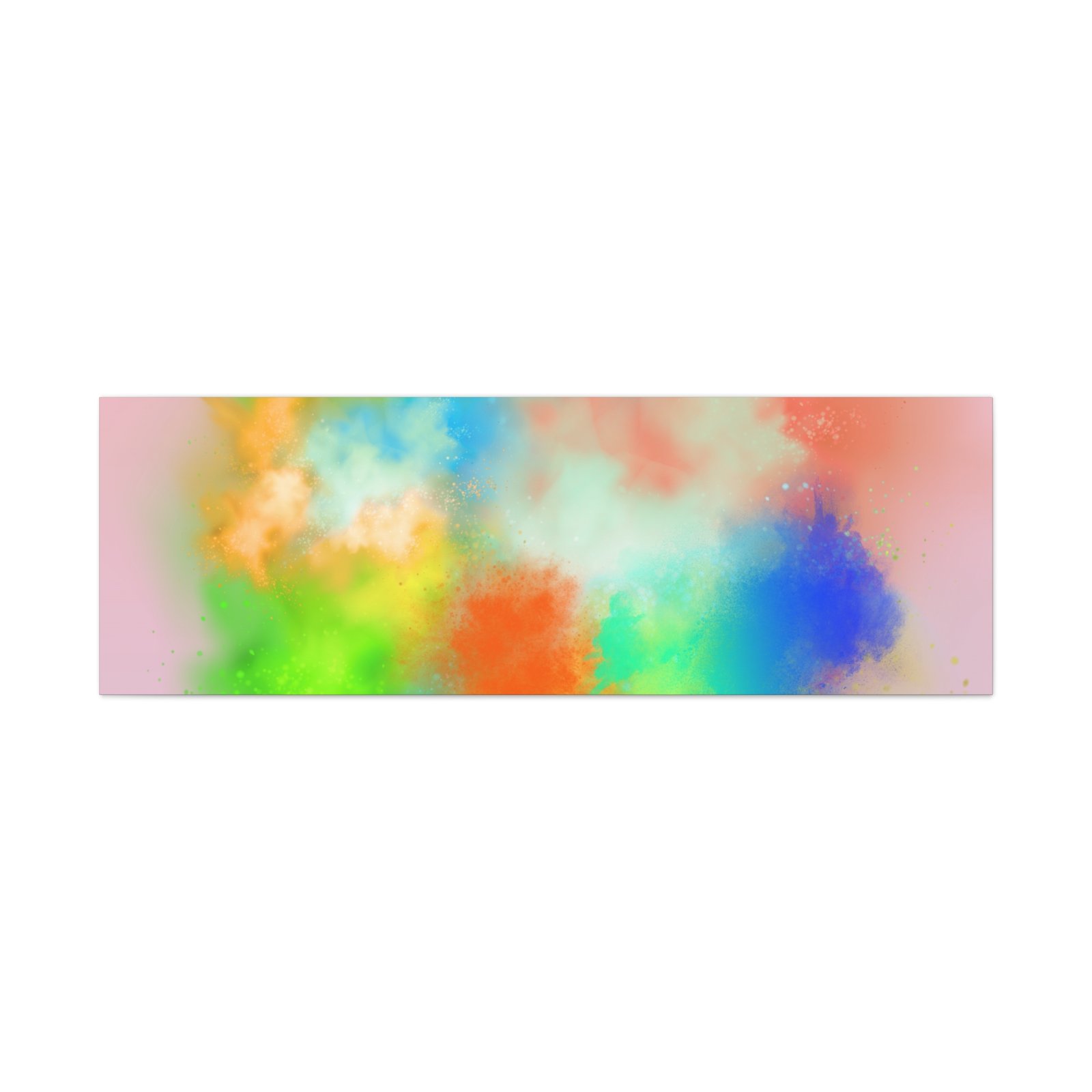A vibrant stretched canvas that brings an airy splash of color into calm, modern spaces. Soft pink undertones cradle bursts of emerald, cobalt, coral and sunshine—like a painterly breath captured mid-motion. Lightweight yet sturdy, the matte finish mutes glare and highlights texture so the colors feel layered and alive on the wall. Hang it above a reading nook, over a minimalist mantel, or in a creative workspace to invite warmth and playful energy without overwhelming the room. The subtle depth from the wrapped edges and the secure back-hanging hardware keep it looking polished and effortless.