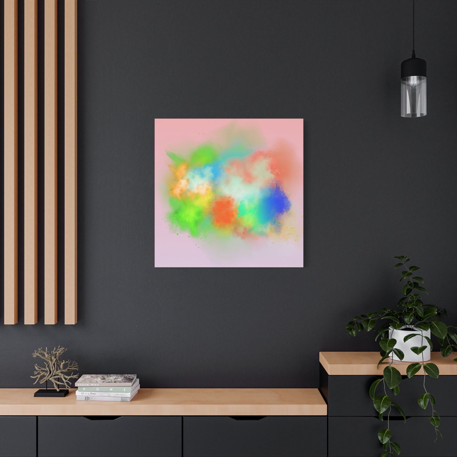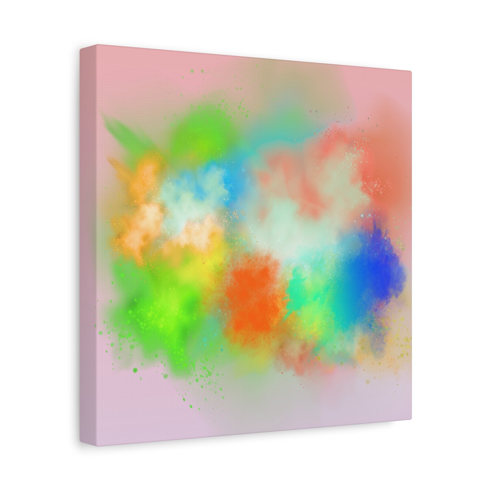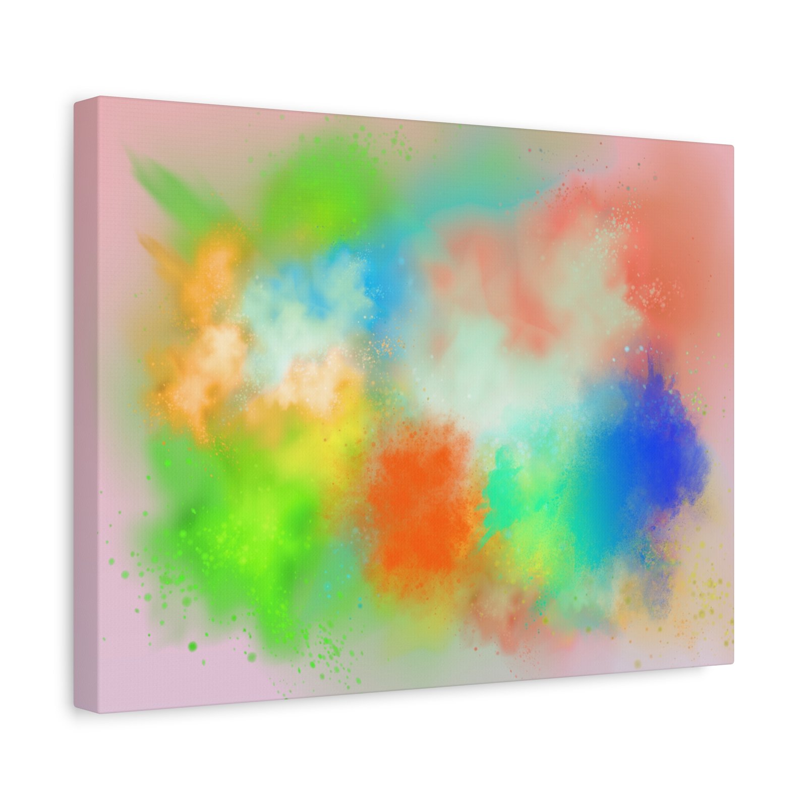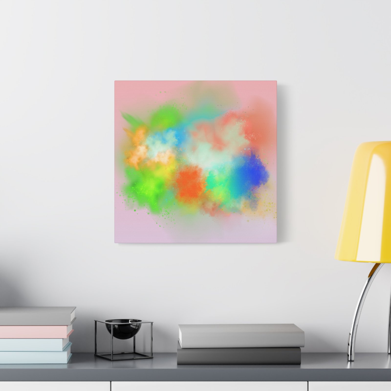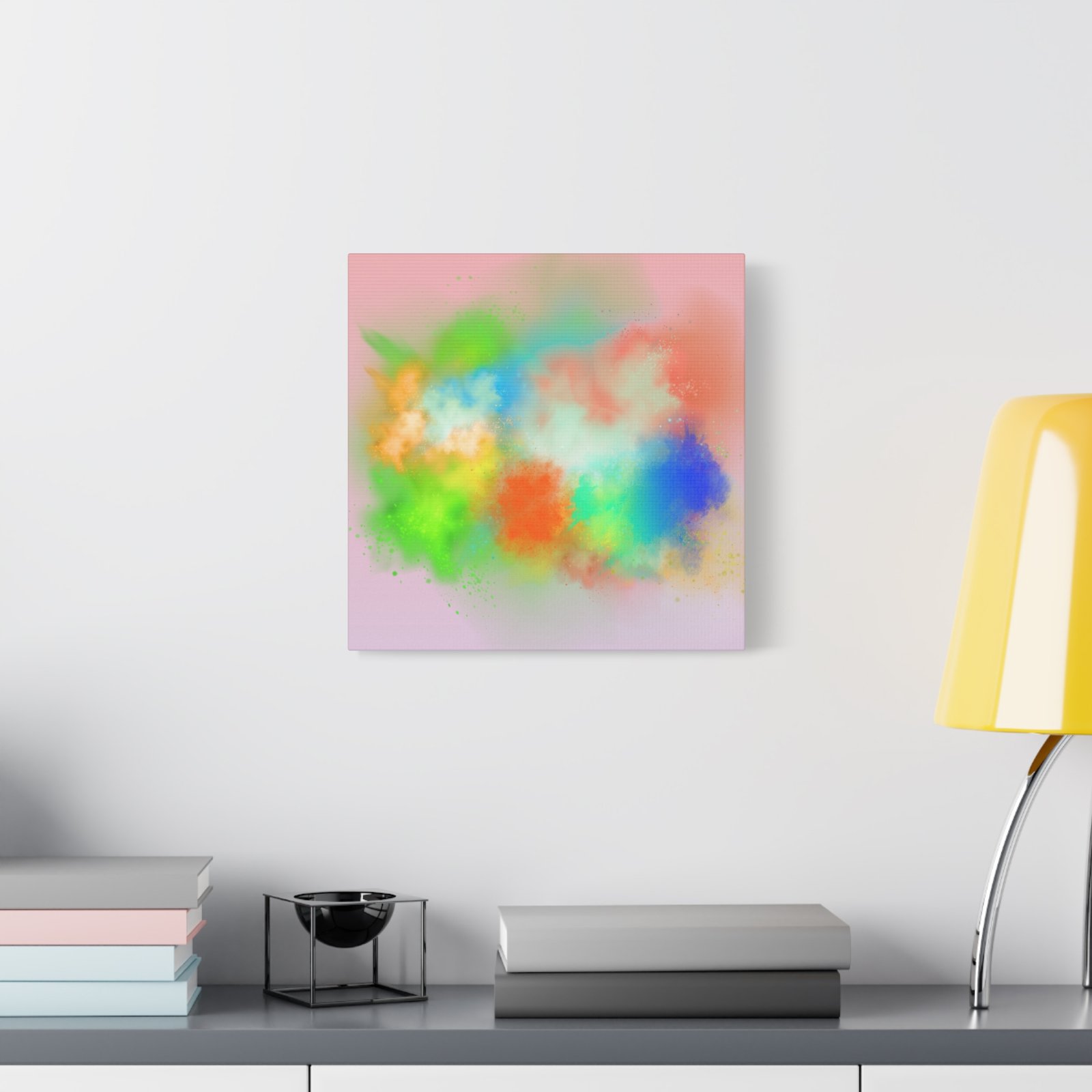 A vibrant stretched canvas that brings an airy splash of color into calm, modern spaces. Soft pink undertones cradle bursts of emerald, cobalt, coral and sunshine—like a painterly breath captured mid-motion. Lightweight yet sturdy, the matte finish mutes glare and highlights texture so the colors feel layered and alive on the wall. Hang it above a reading nook, over a minimalist mantel, or in a creative workspace to invite warmth and playful energy without overwhelming the room. The subtle depth from the wrapped edges and the secure back-hanging hardware keep it looking polished and effortless.