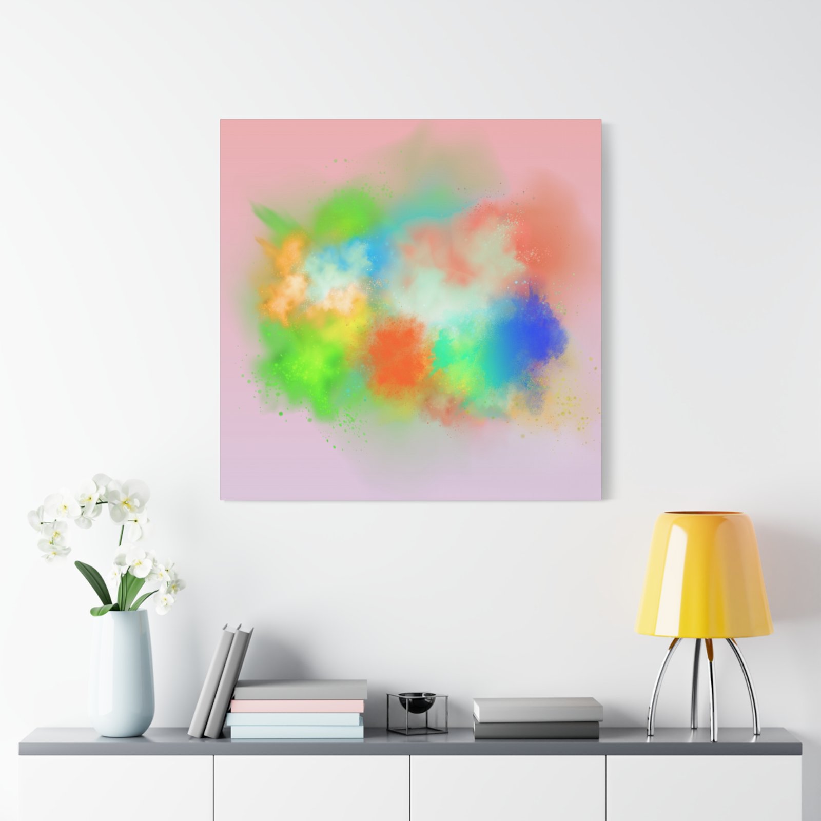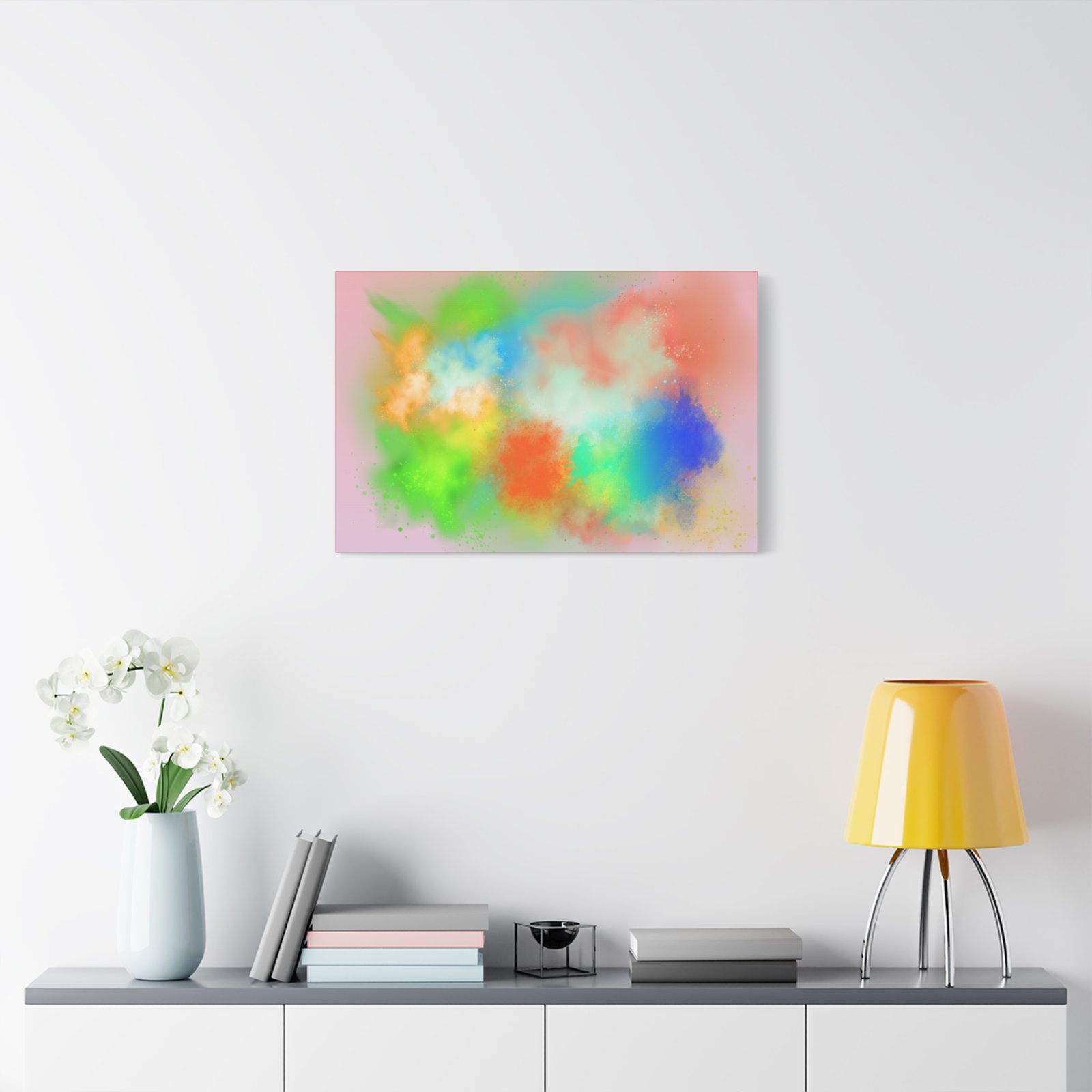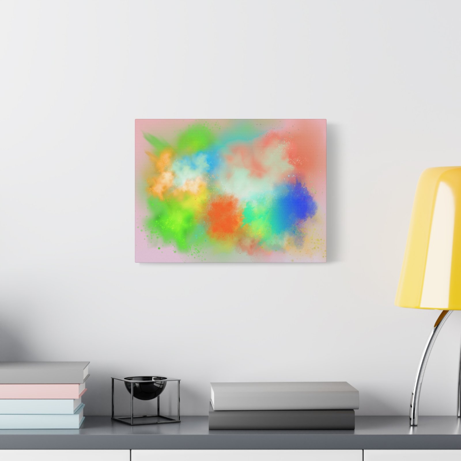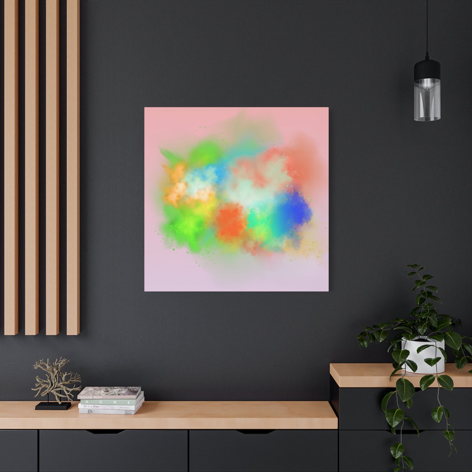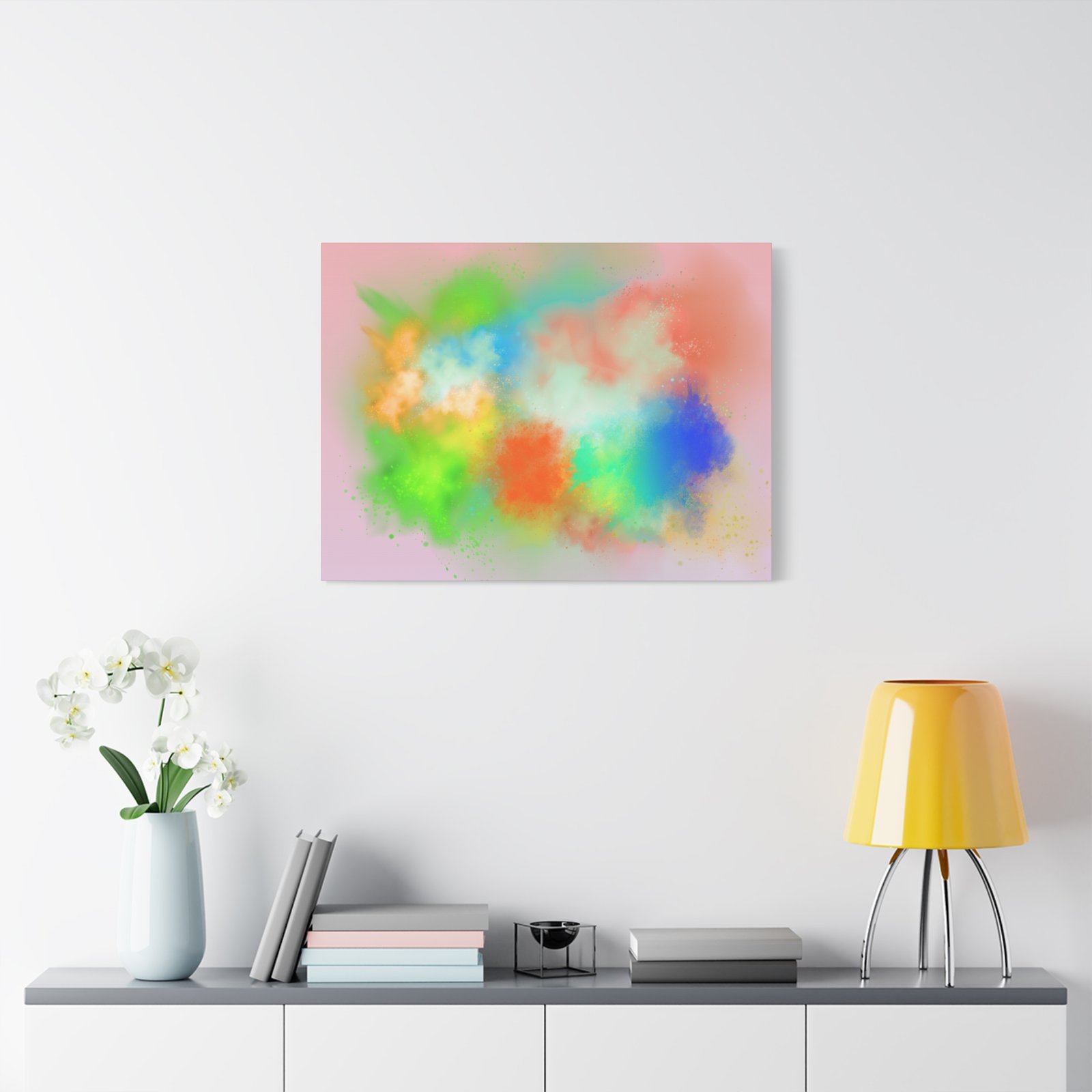 A vibrant stretched canvas that brings an airy splash of color into calm, modern spaces. Soft pink undertones cradle bursts of emerald, cobalt, coral and sunshine—like a painterly breath captured mid-motion. Lightweight yet sturdy, the matte finish mutes glare and highlights texture so the colors feel layered and alive on the wall. Hang it above a reading nook, over a minimalist mantel, or in a creative workspace to invite warmth and playful energy without overwhelming the room. The subtle depth from the wrapped edges and the secure back-hanging hardware keep it looking polished and effortless.