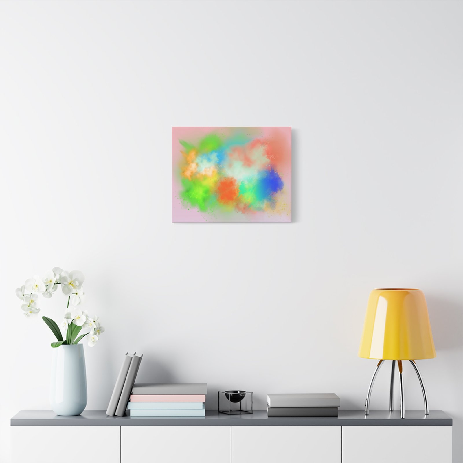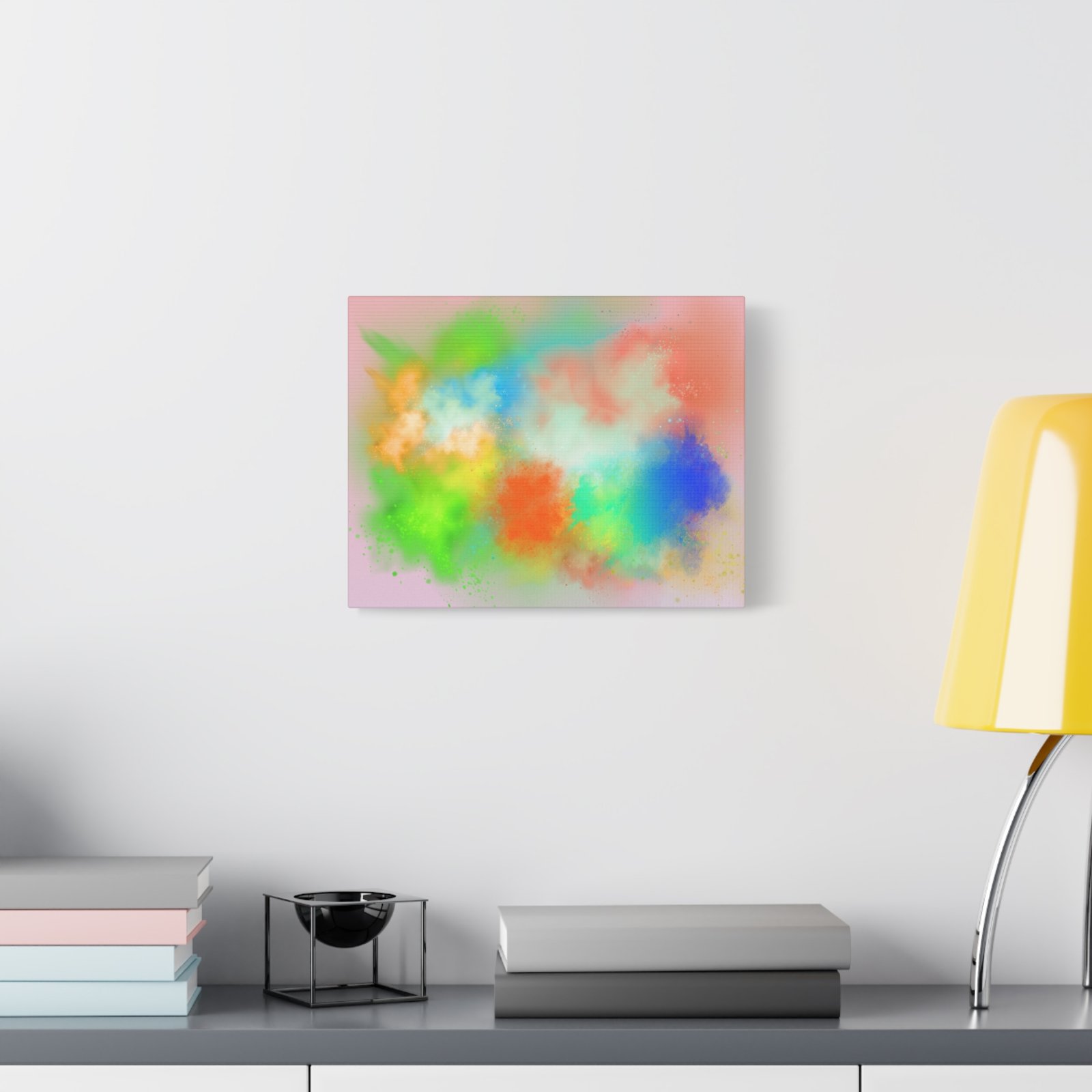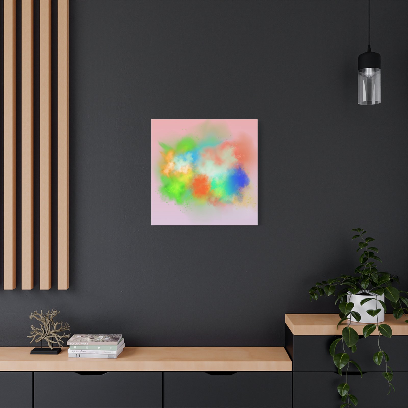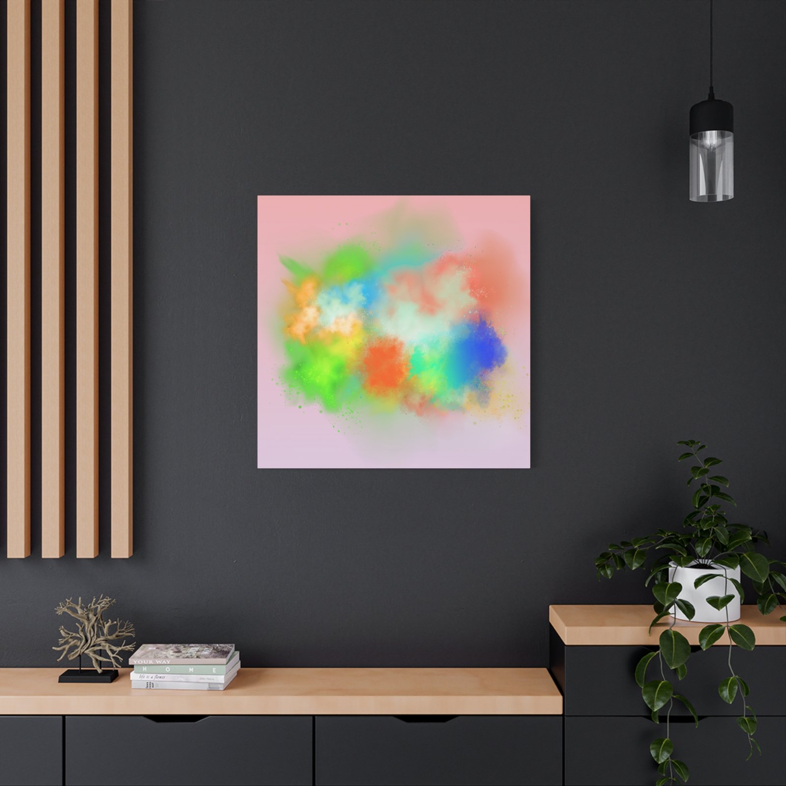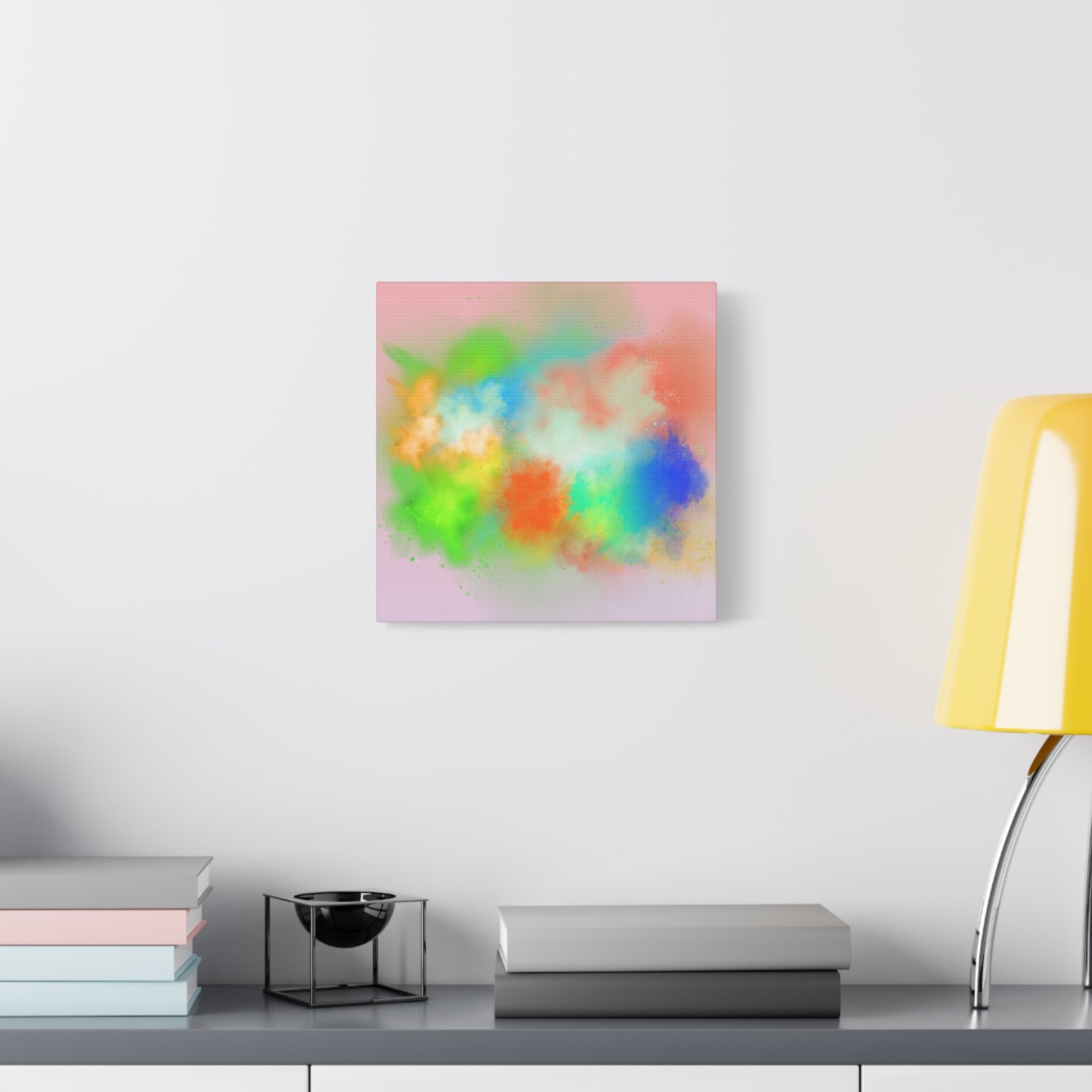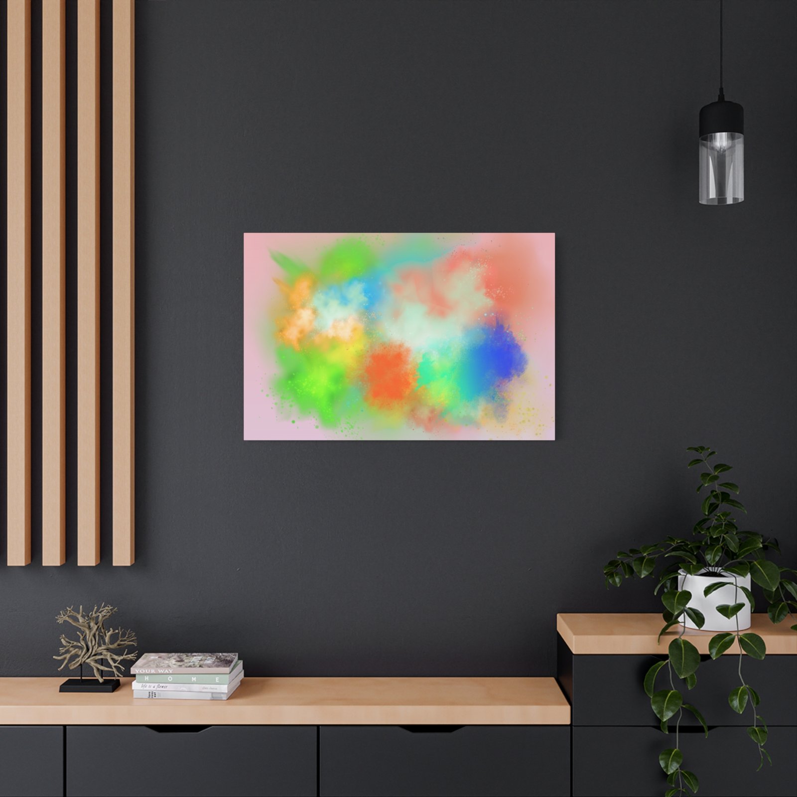 A vibrant stretched canvas that brings an airy splash of color into calm, modern spaces. Soft pink undertones cradle bursts of emerald, cobalt, coral and sunshine—like a painterly breath captured mid-motion. Lightweight yet sturdy, the matte finish mutes glare and highlights texture so the colors feel layered and alive on the wall. Hang it above a reading nook, over a minimalist mantel, or in a creative workspace to invite warmth and playful energy without overwhelming the room. The subtle depth from the wrapped edges and the secure back-hanging hardware keep it looking polished and effortless.
