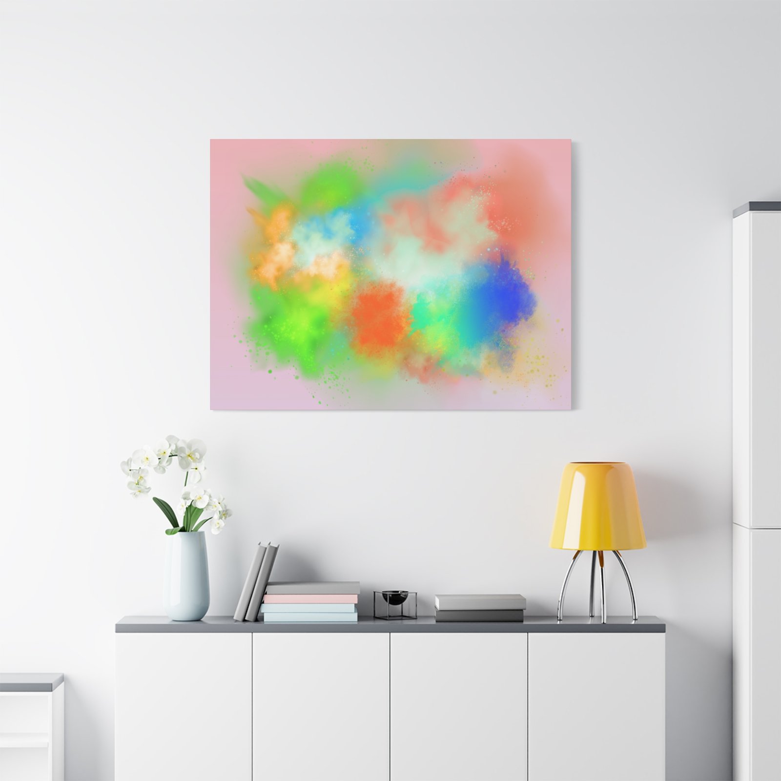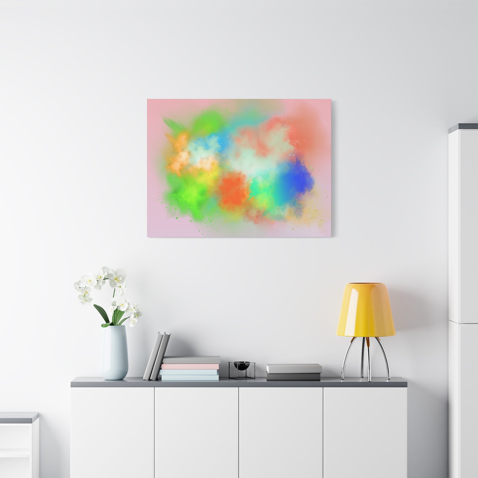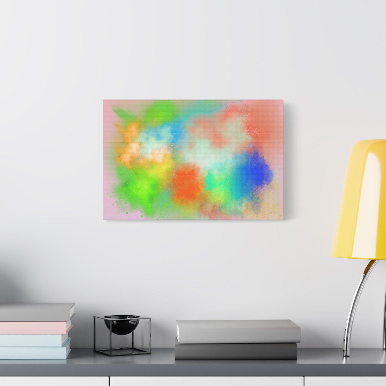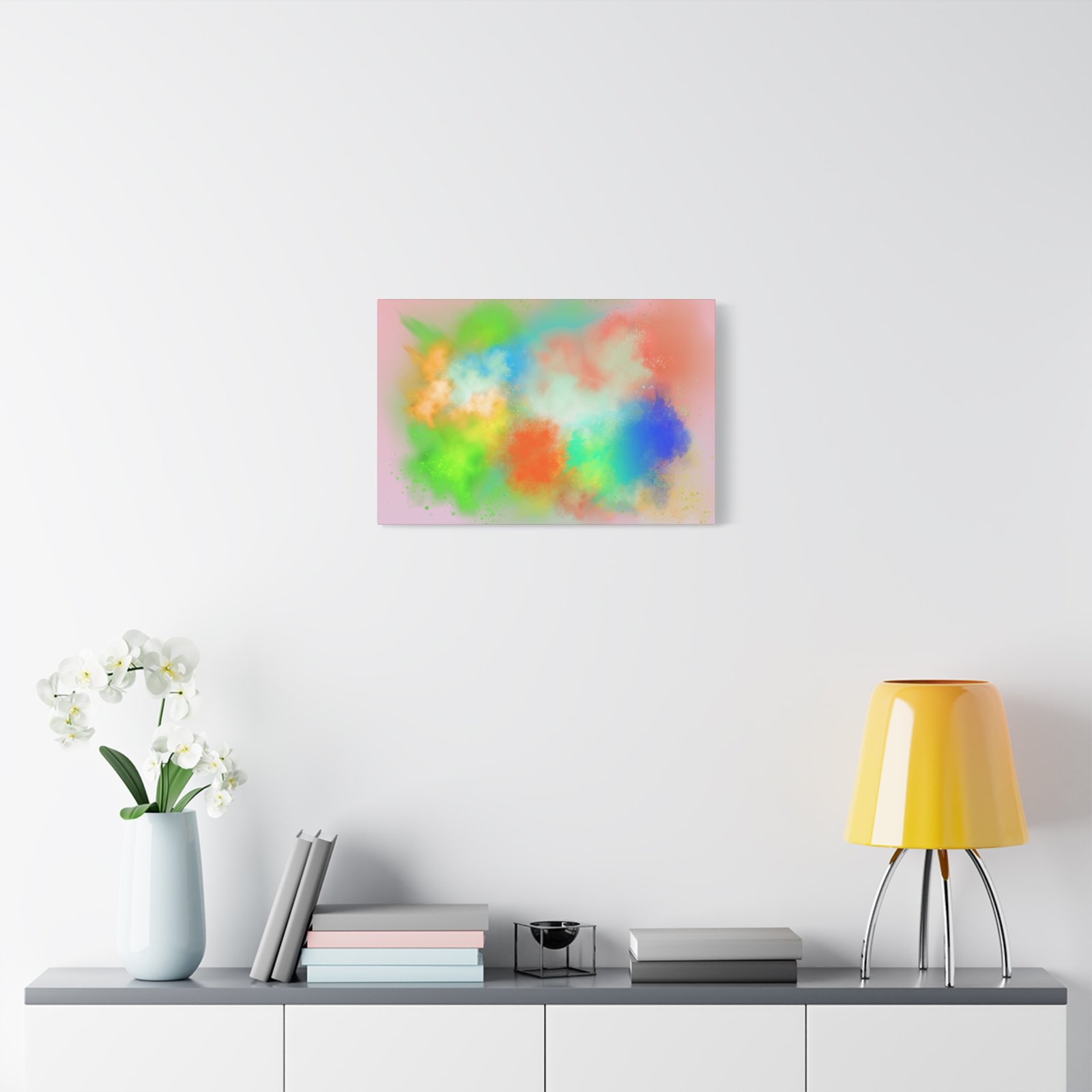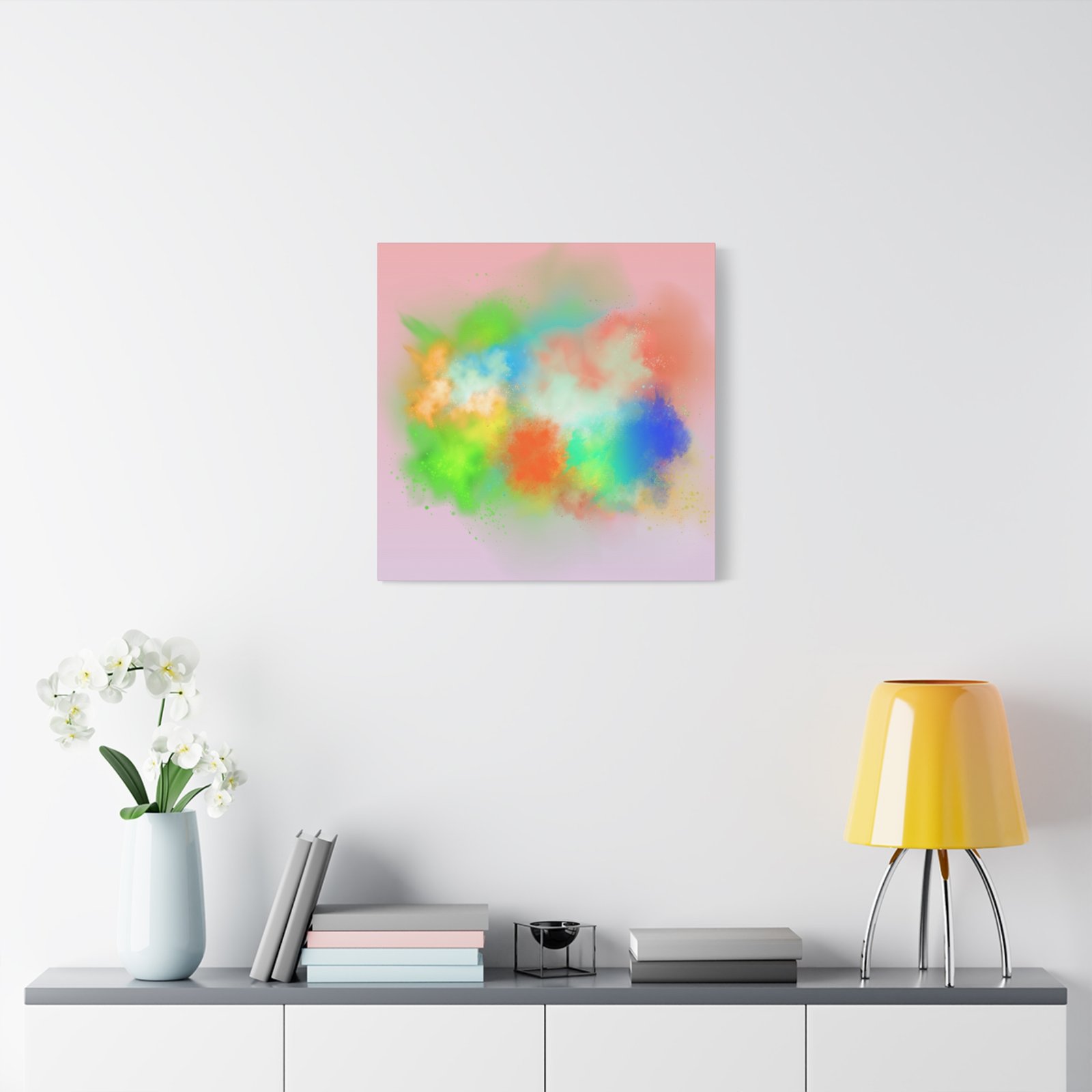 A vibrant stretched canvas that brings an airy splash of color into calm, modern spaces. Soft pink undertones cradle bursts of emerald, cobalt, coral and sunshine—like a painterly breath captured mid-motion. Lightweight yet sturdy, the matte finish mutes glare and highlights texture so the colors feel layered and alive on the wall. Hang it above a reading nook, over a minimalist mantel, or in a creative workspace to invite warmth and playful energy without overwhelming the room. The subtle depth from the wrapped edges and the secure back-hanging hardware keep it looking polished and effortless.