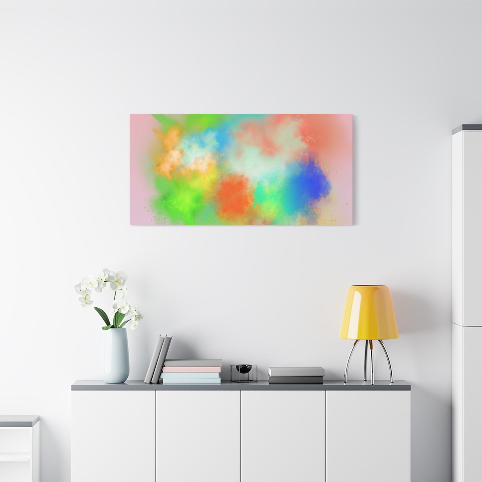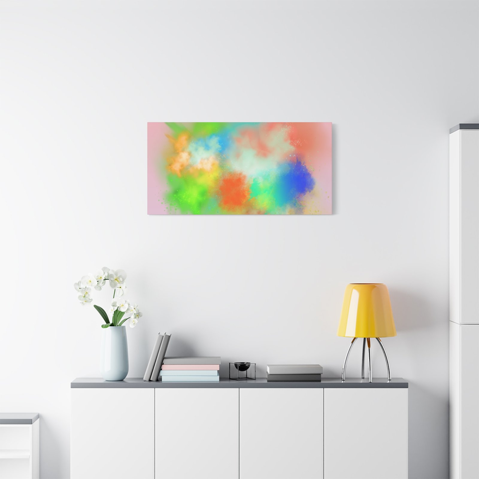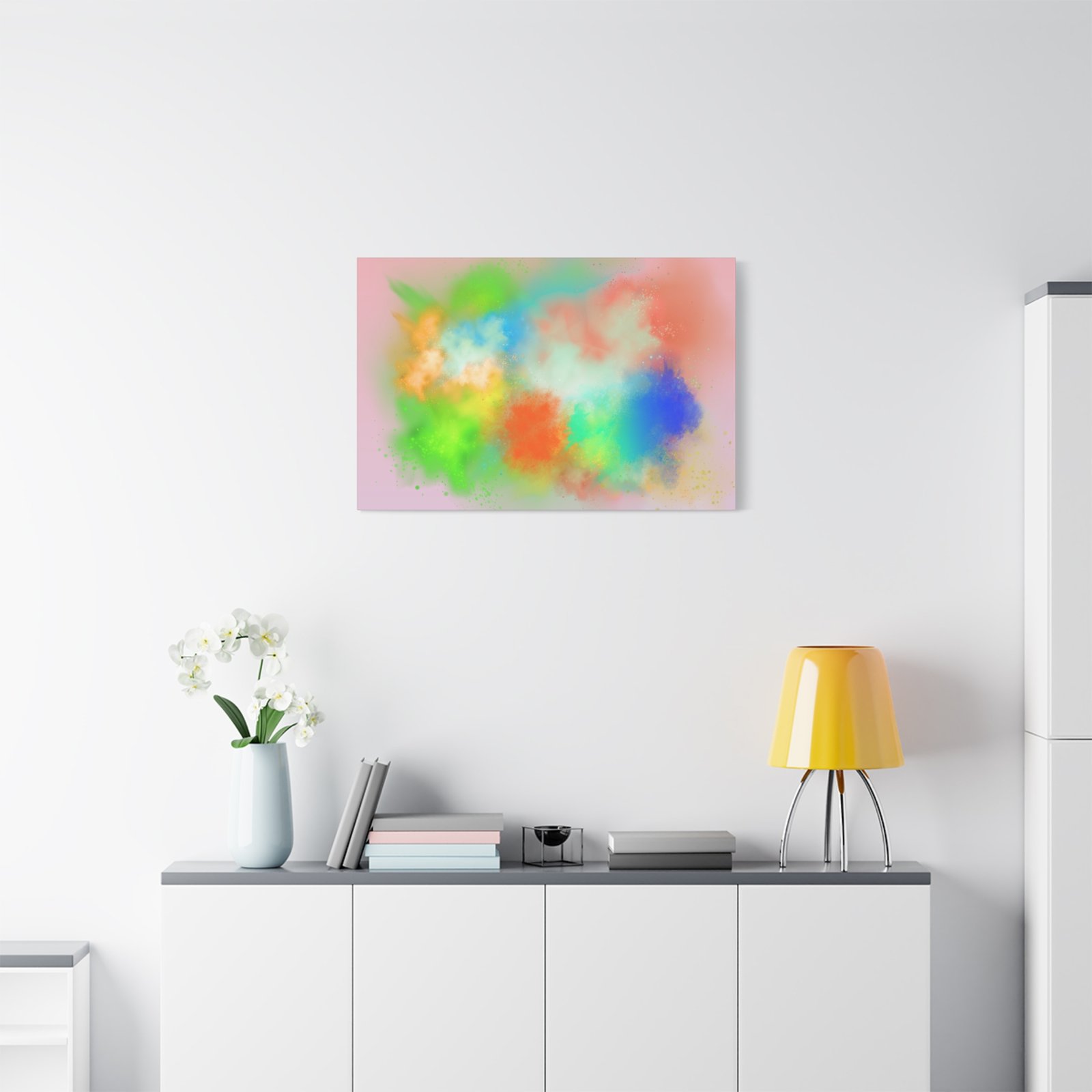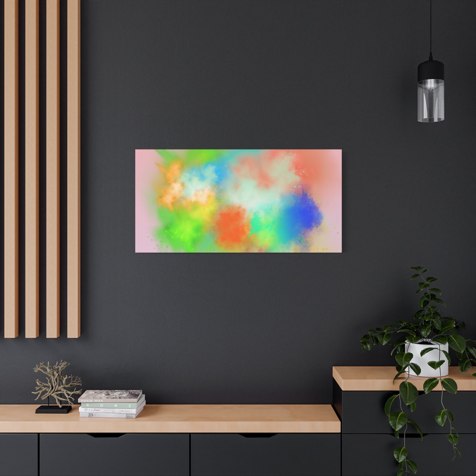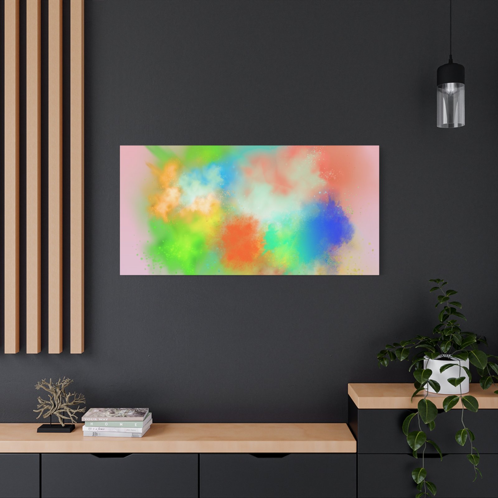 A vibrant stretched canvas that brings an airy splash of color into calm, modern spaces. Soft pink undertones cradle bursts of emerald, cobalt, coral and sunshine—like a painterly breath captured mid-motion. Lightweight yet sturdy, the matte finish mutes glare and highlights texture so the colors feel layered and alive on the wall. Hang it above a reading nook, over a minimalist mantel, or in a creative workspace to invite warmth and playful energy without overwhelming the room. The subtle depth from the wrapped edges and the secure back-hanging hardware keep it looking polished and effortless.