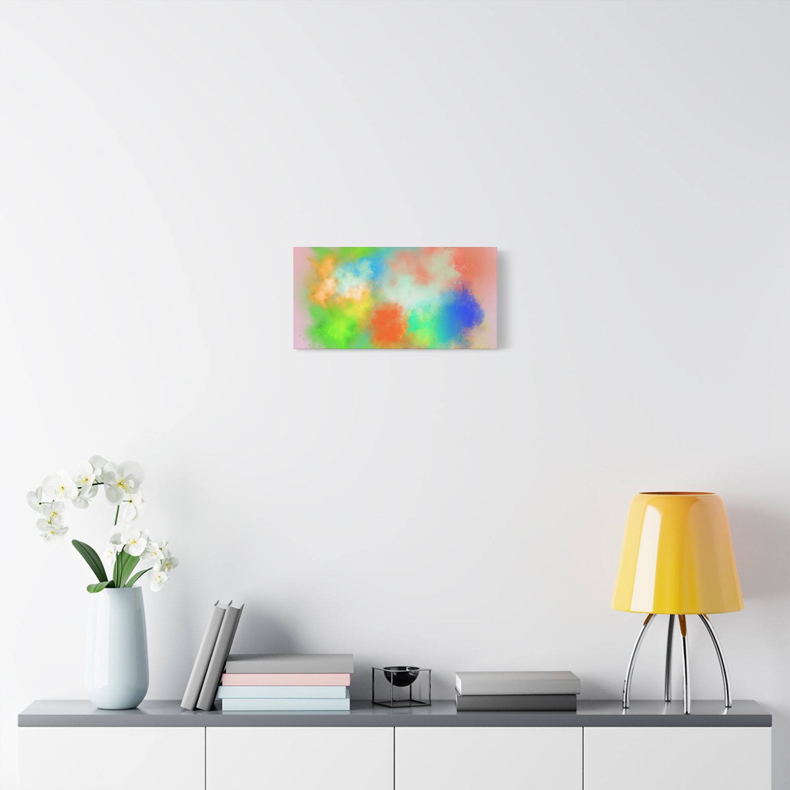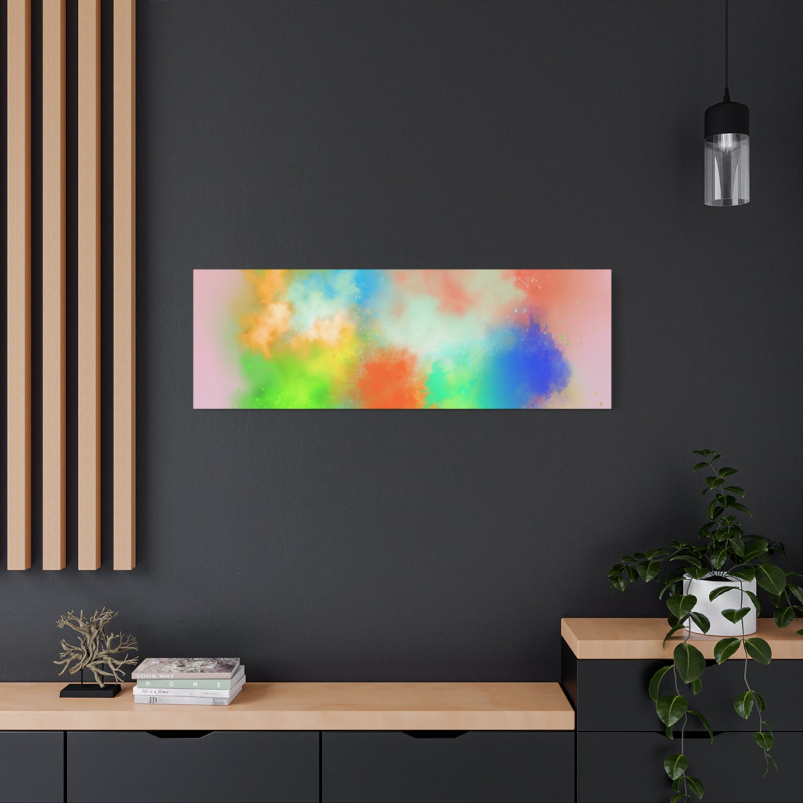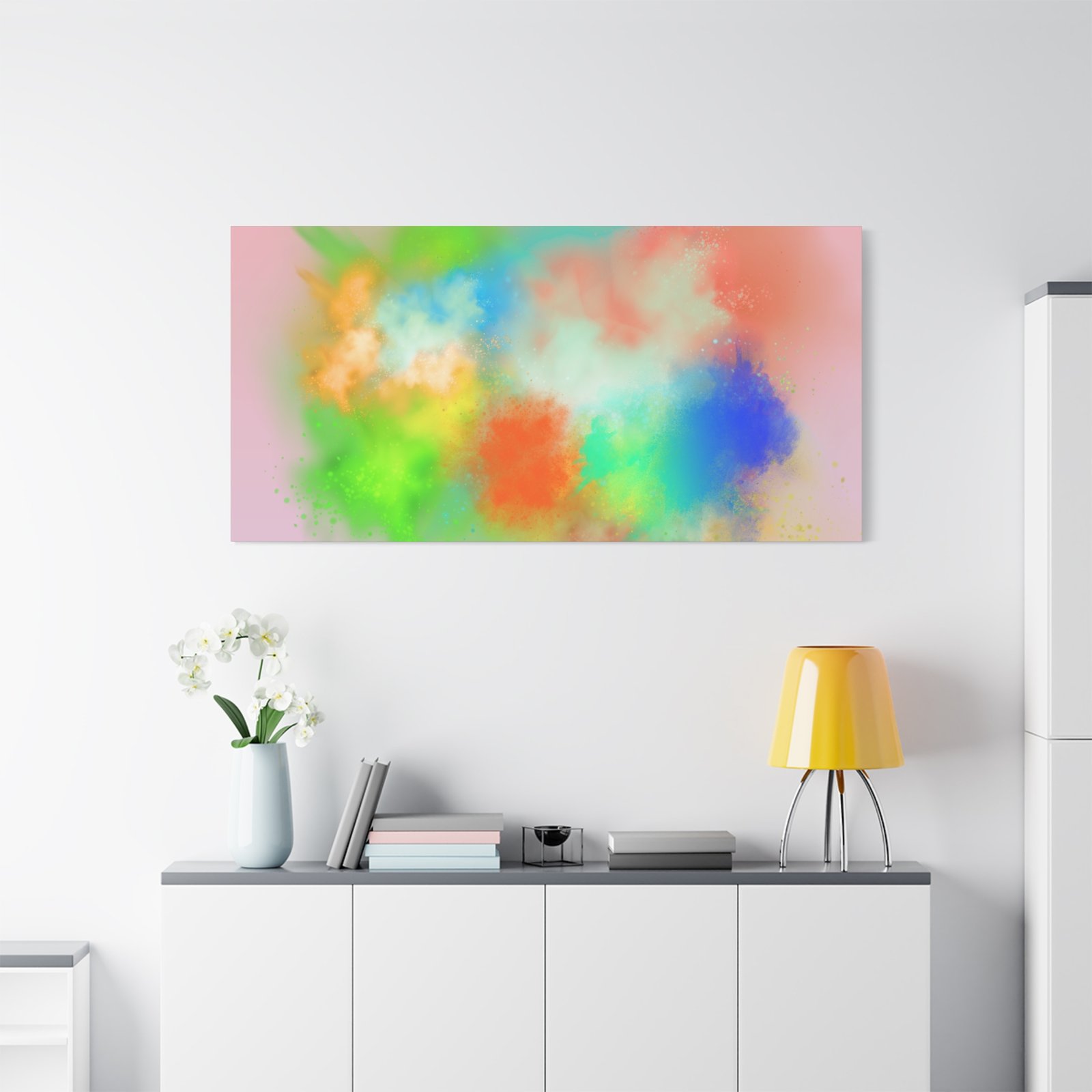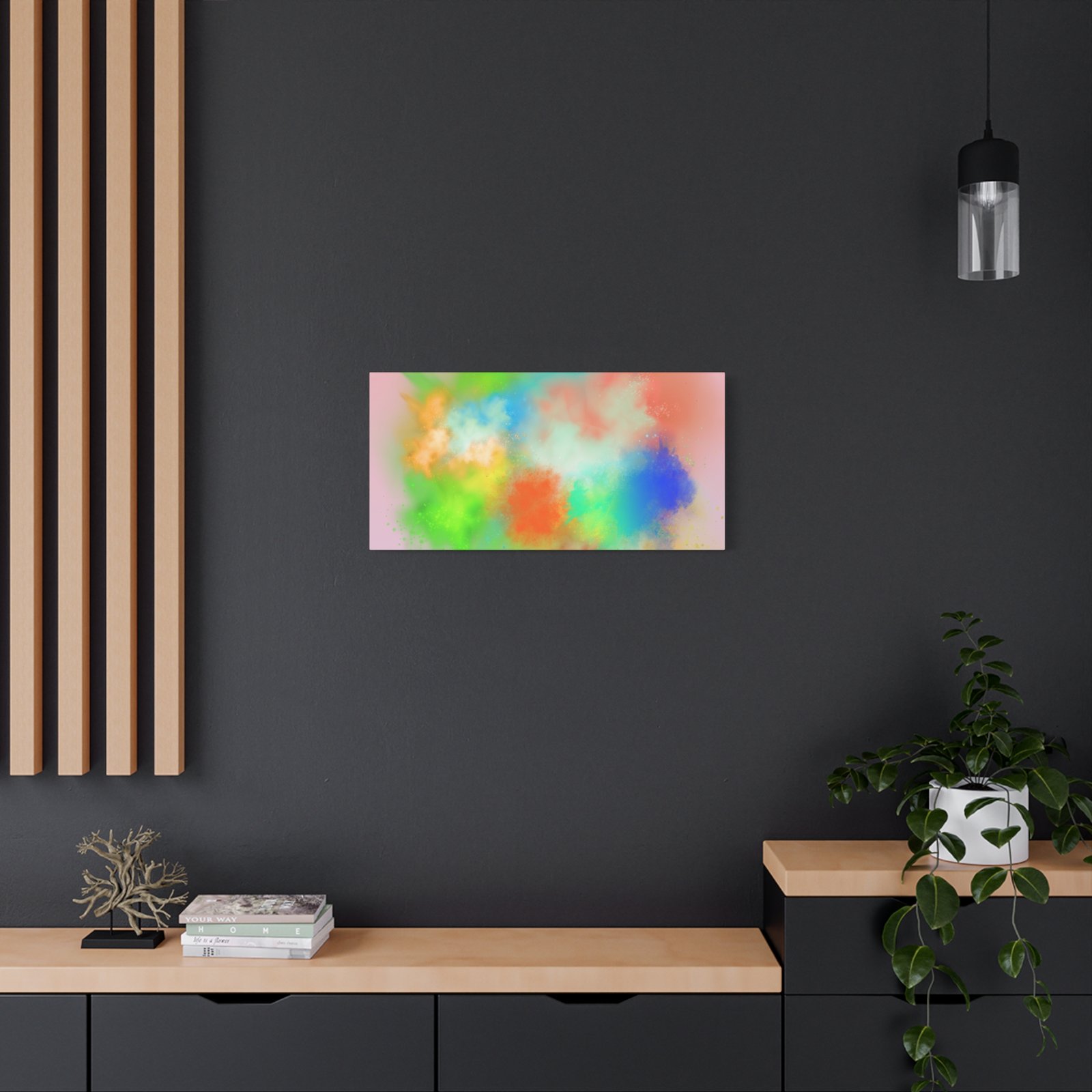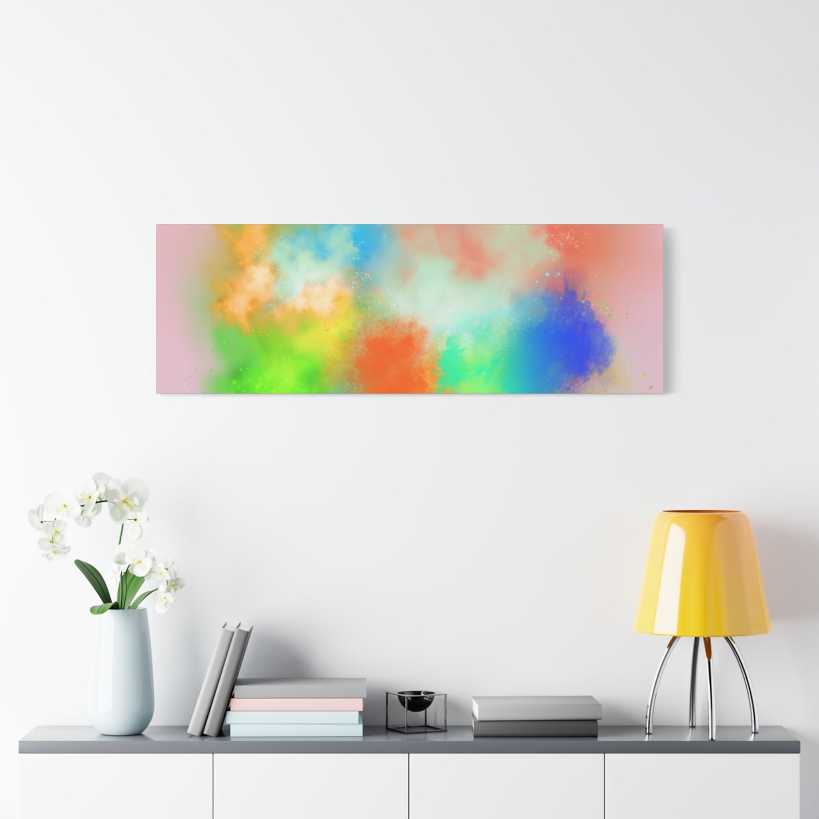 A vibrant stretched canvas that brings an airy splash of color into calm, modern spaces. Soft pink undertones cradle bursts of emerald, cobalt, coral and sunshine—like a painterly breath captured mid-motion. Lightweight yet sturdy, the matte finish mutes glare and highlights texture so the colors feel layered and alive on the wall. Hang it above a reading nook, over a minimalist mantel, or in a creative workspace to invite warmth and playful energy without overwhelming the room. The subtle depth from the wrapped edges and the secure back-hanging hardware keep it looking polished and effortless.