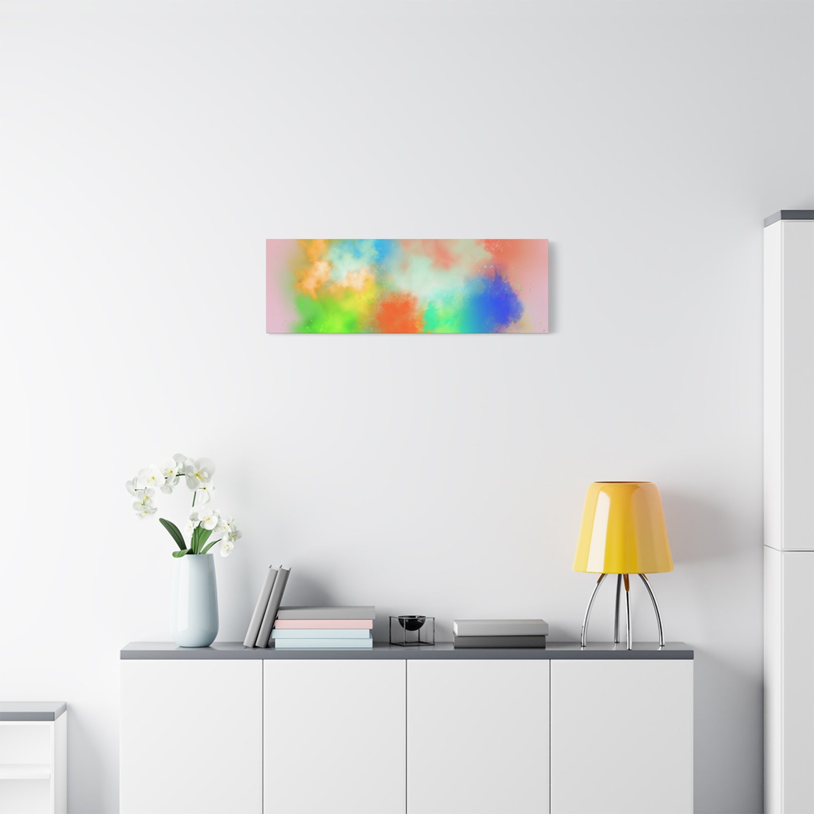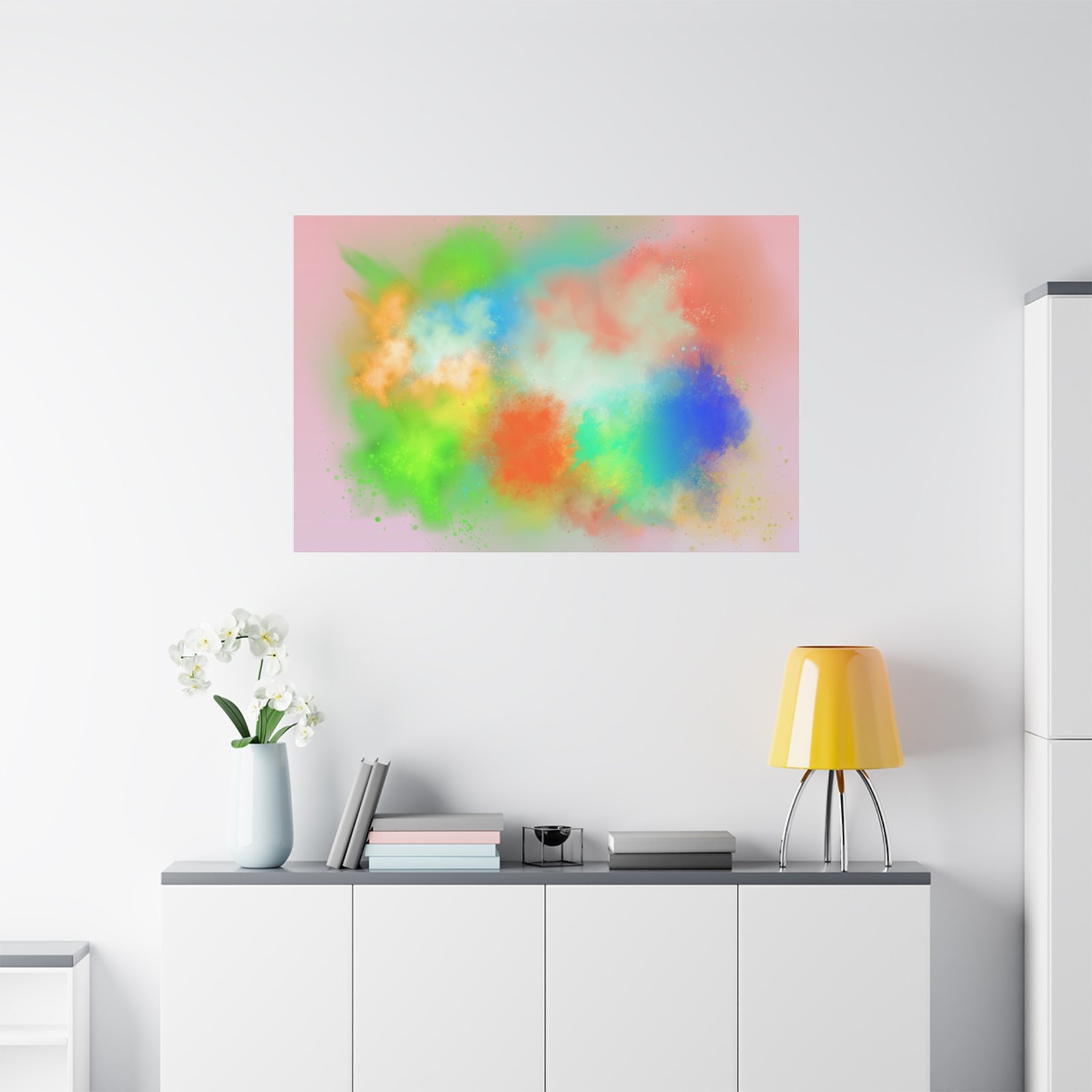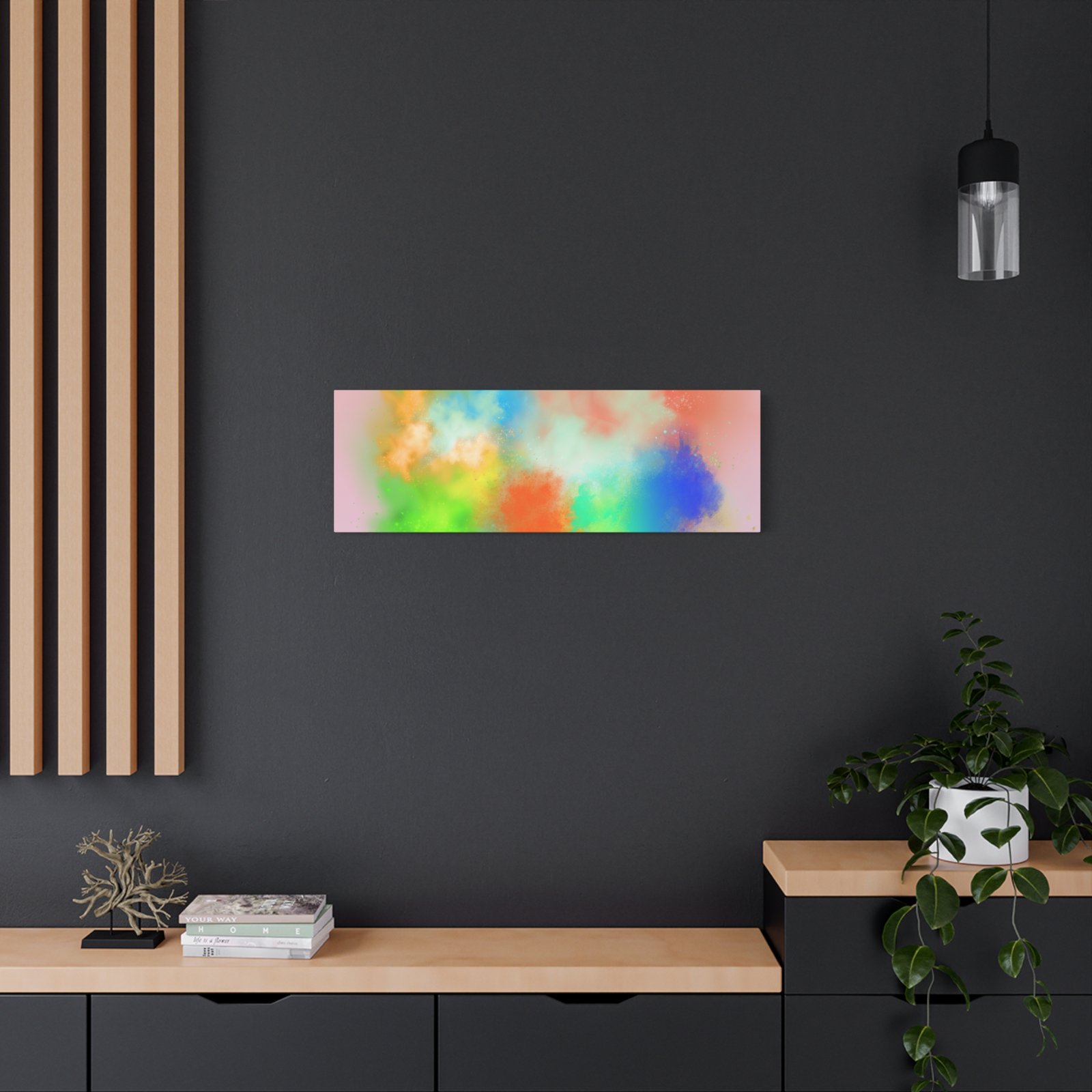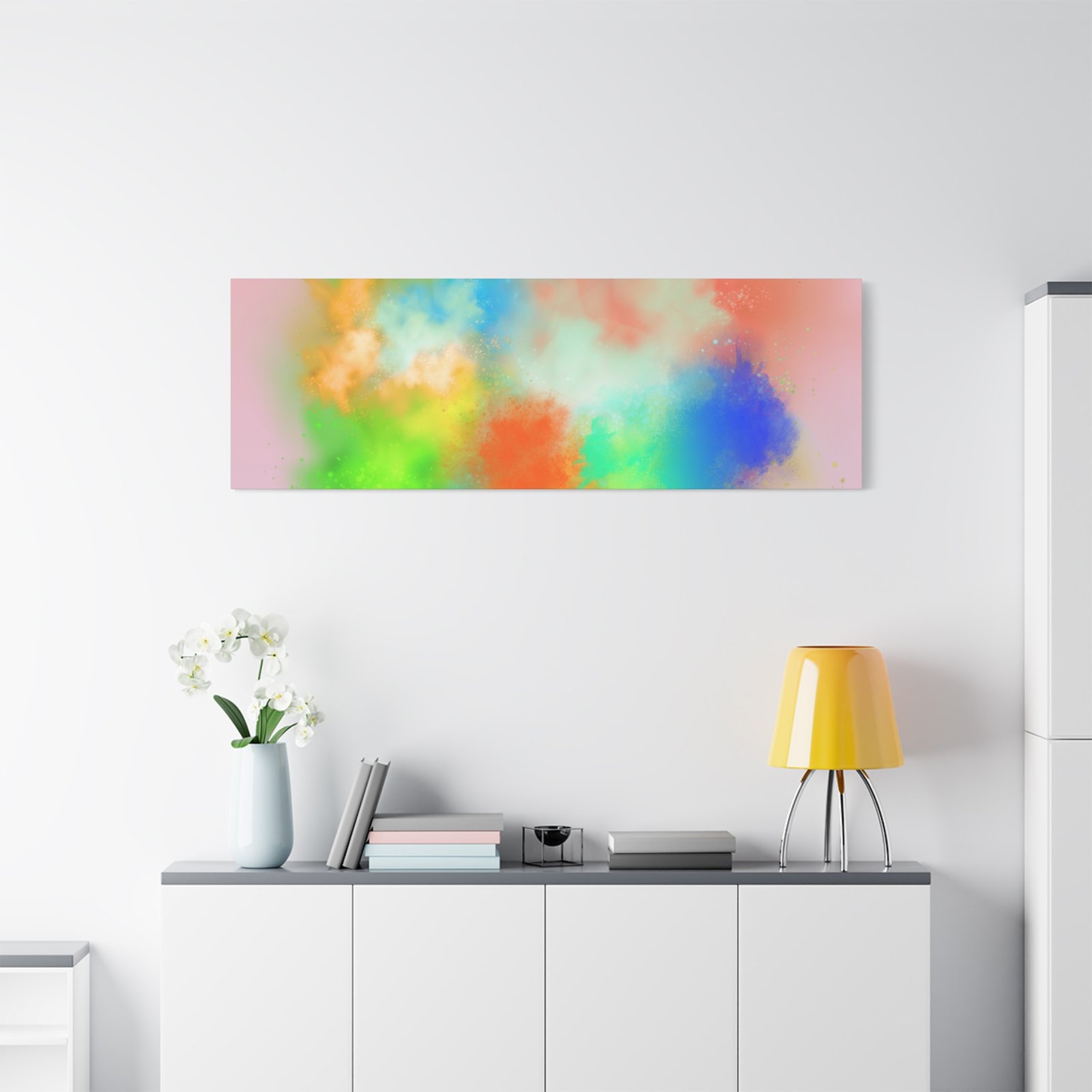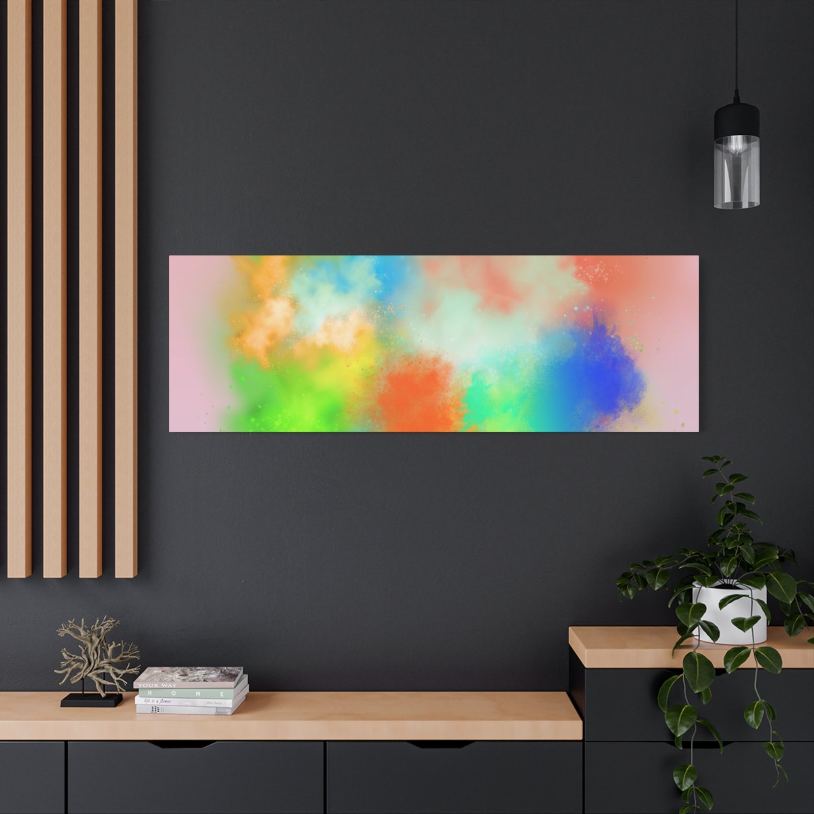 A vibrant stretched canvas that brings an airy splash of color into calm, modern spaces. Soft pink undertones cradle bursts of emerald, cobalt, coral and sunshine—like a painterly breath captured mid-motion. Lightweight yet sturdy, the matte finish mutes glare and highlights texture so the colors feel layered and alive on the wall. Hang it above a reading nook, over a minimalist mantel, or in a creative workspace to invite warmth and playful energy without overwhelming the room. The subtle depth from the wrapped edges and the secure back-hanging hardware keep it looking polished and effortless.