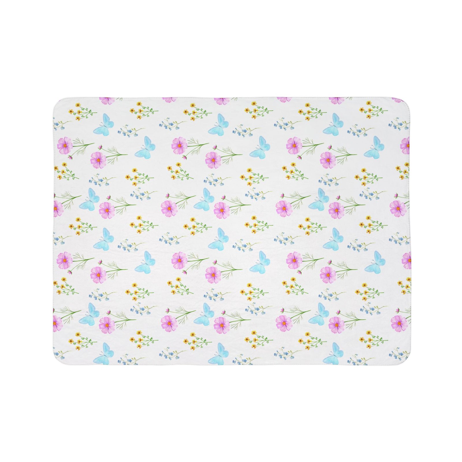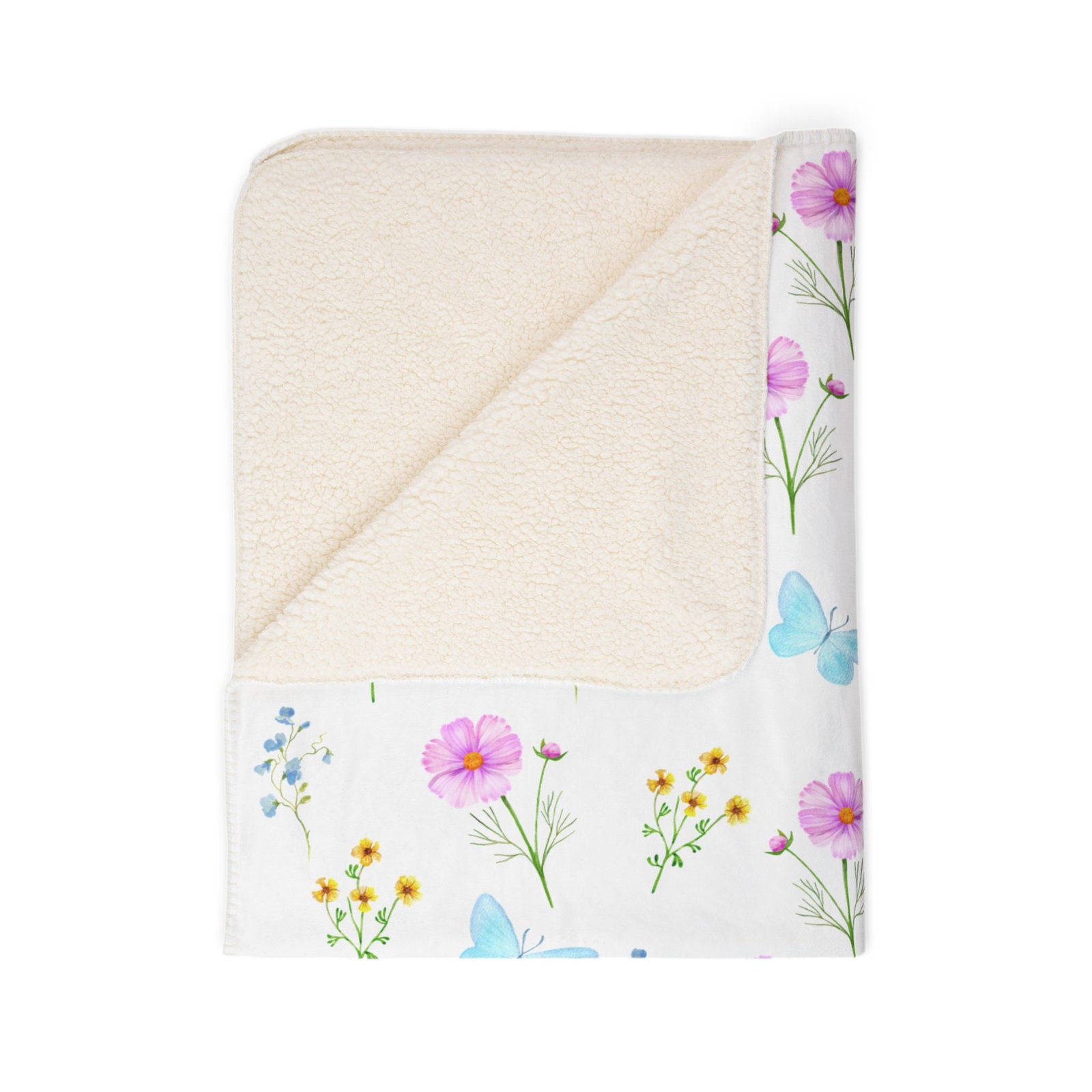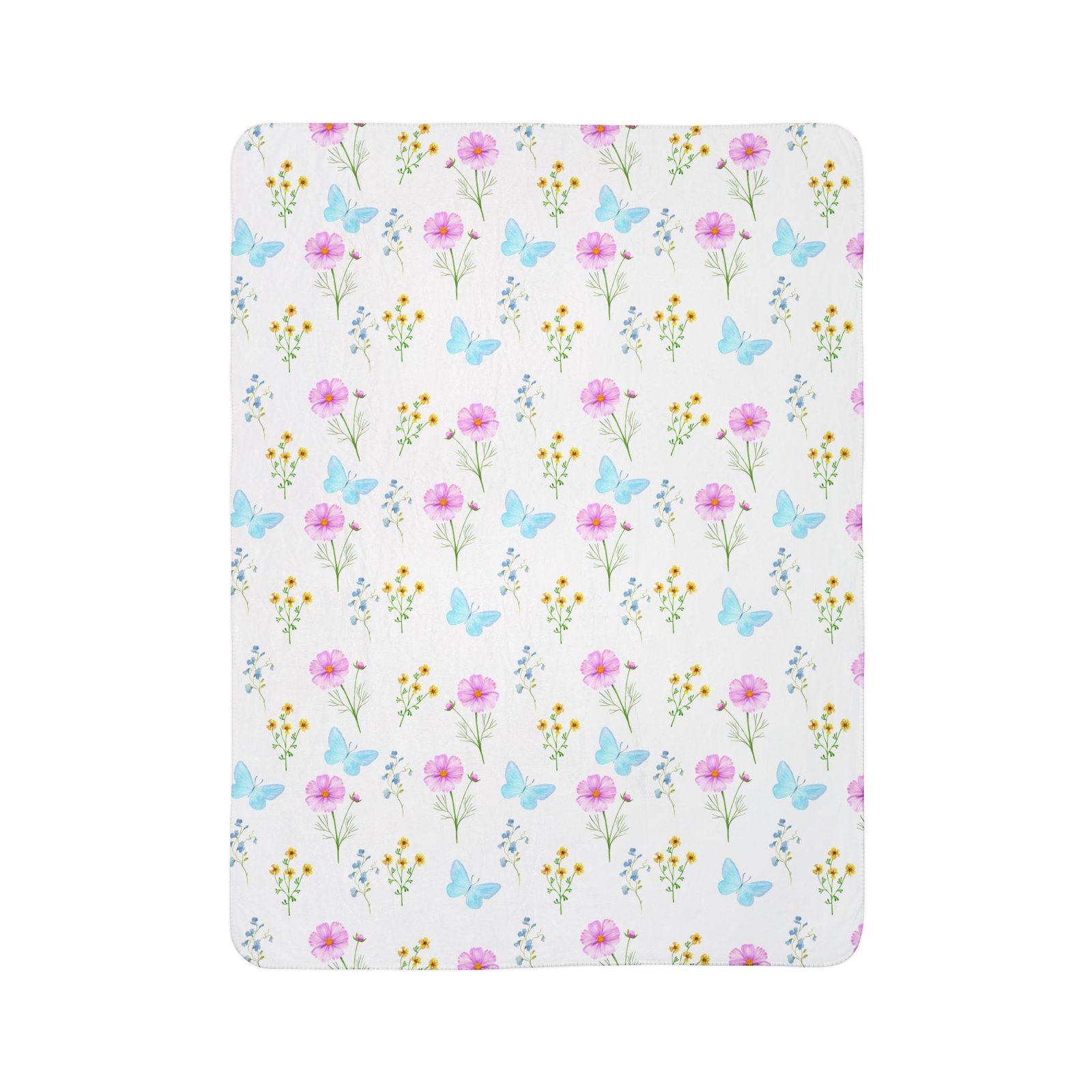A plush sherpa blanket patterned with soft watercolor florals and pale blue butterflies. The double-sided, thick polyester fleece wraps you in a warm, cloud-like hug while the bright, detailed print keeps a light, airy mood across beds, couches, or nursery corners. Lightweight enough for year-round cuddling yet substantial in weight and texture, it layers easily over duvets or folds into a travel throw for picnics and porch evenings. The hemmed edges and matched seam thread keep the design tidy wash after wash, and the sewn-in label sits unobtrusively at the corner. For anyone who loves gentle, nature-inspired prints and cozy comfort, this blanket brings that calm meadow feeling into everyday life.